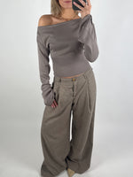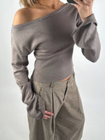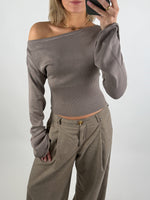 Feminin og moderne CARTER one shoulder bluse, brun med unikke detaljer. Blusen har en flot, bred bådudskæring, der kan trækkes let ned over den ene skulder for et elegant, afslappet look.