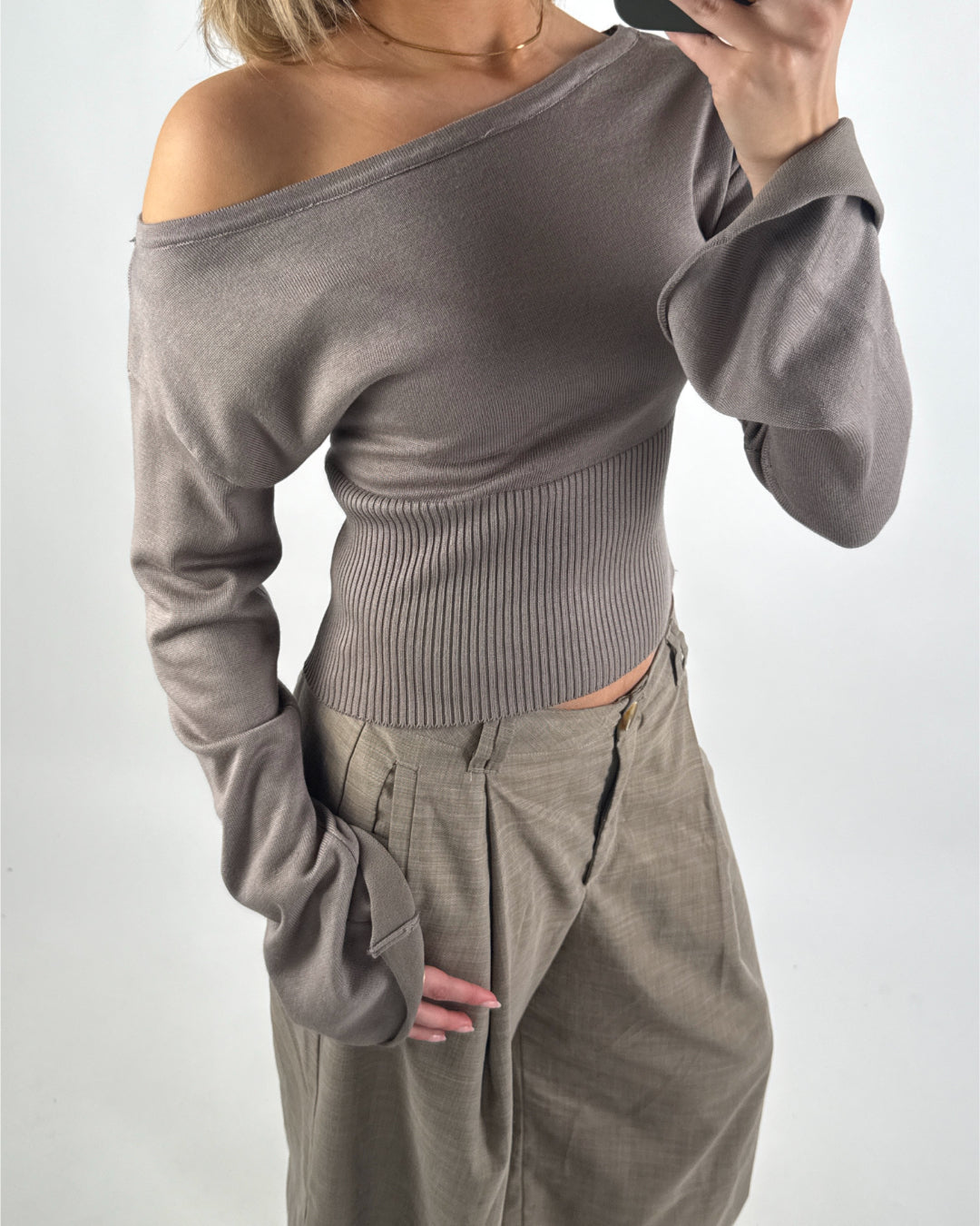 Pasformen er figursyet med en bred, ribstrikket kant i taljen, som fremhæver kroppens form på en smuk måde. Ærmerne er lange med et let trompet facon, hvilket giver et trendy og sofistikeret udtryk. Blusen laves både i klassisk creme og stilrent brun – nem at style med både nederdele eller højtaljede bukser til hverdagsbrug såvel som til fest.