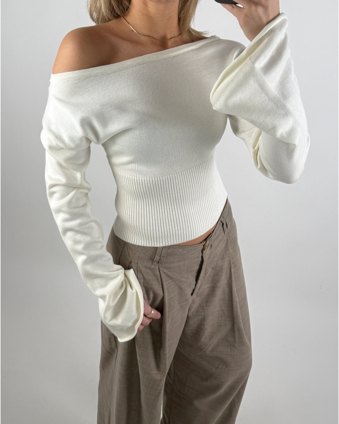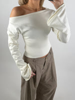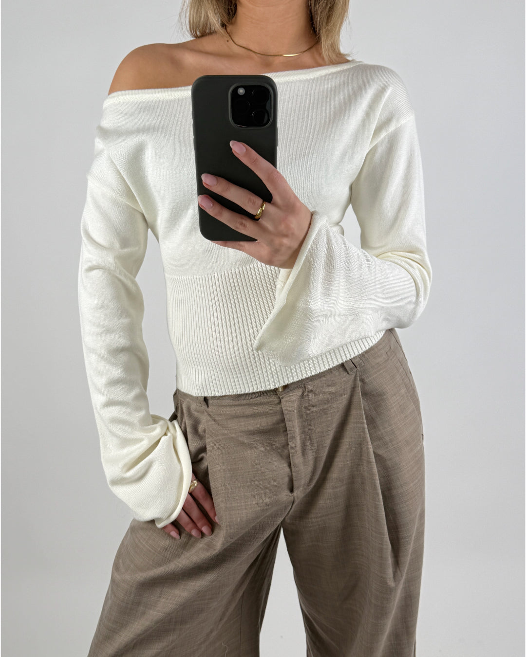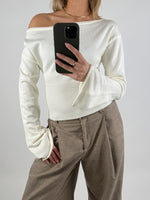 Feminin og moderne CARTER one shoulder bluse, creme med unikke detaljer. Blusen har en flot, bred bådudskæring, der kan trækkes let ned over den ene skulder for et elegant, afslappet look.