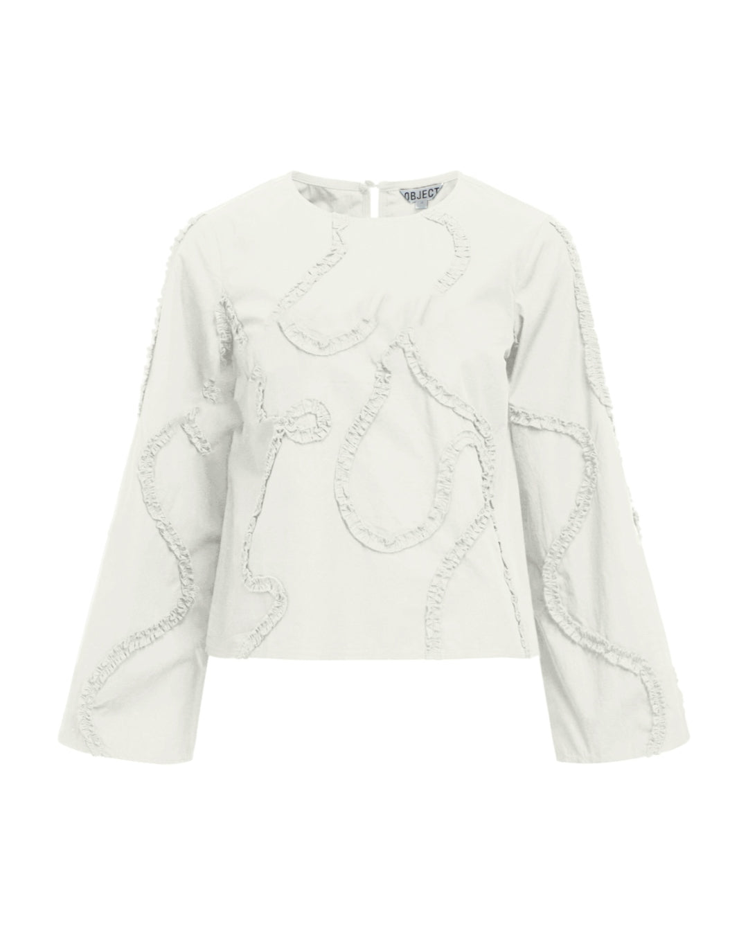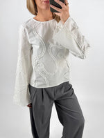 Vores smukke ENESA bluse, hvid er er så fin og enkelt, dog med fine patch detaljer på forside og ærmer. Blusem har rund hals og har knaplukning i nakken, hvilket giver en smuk talje.
