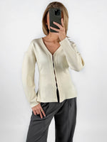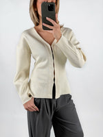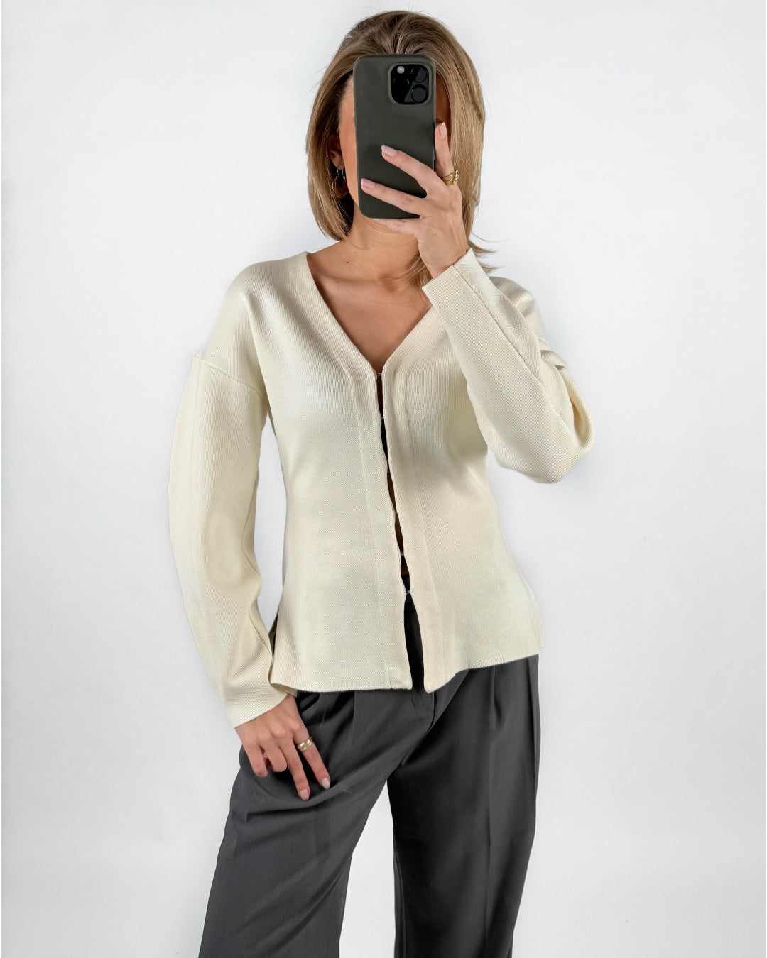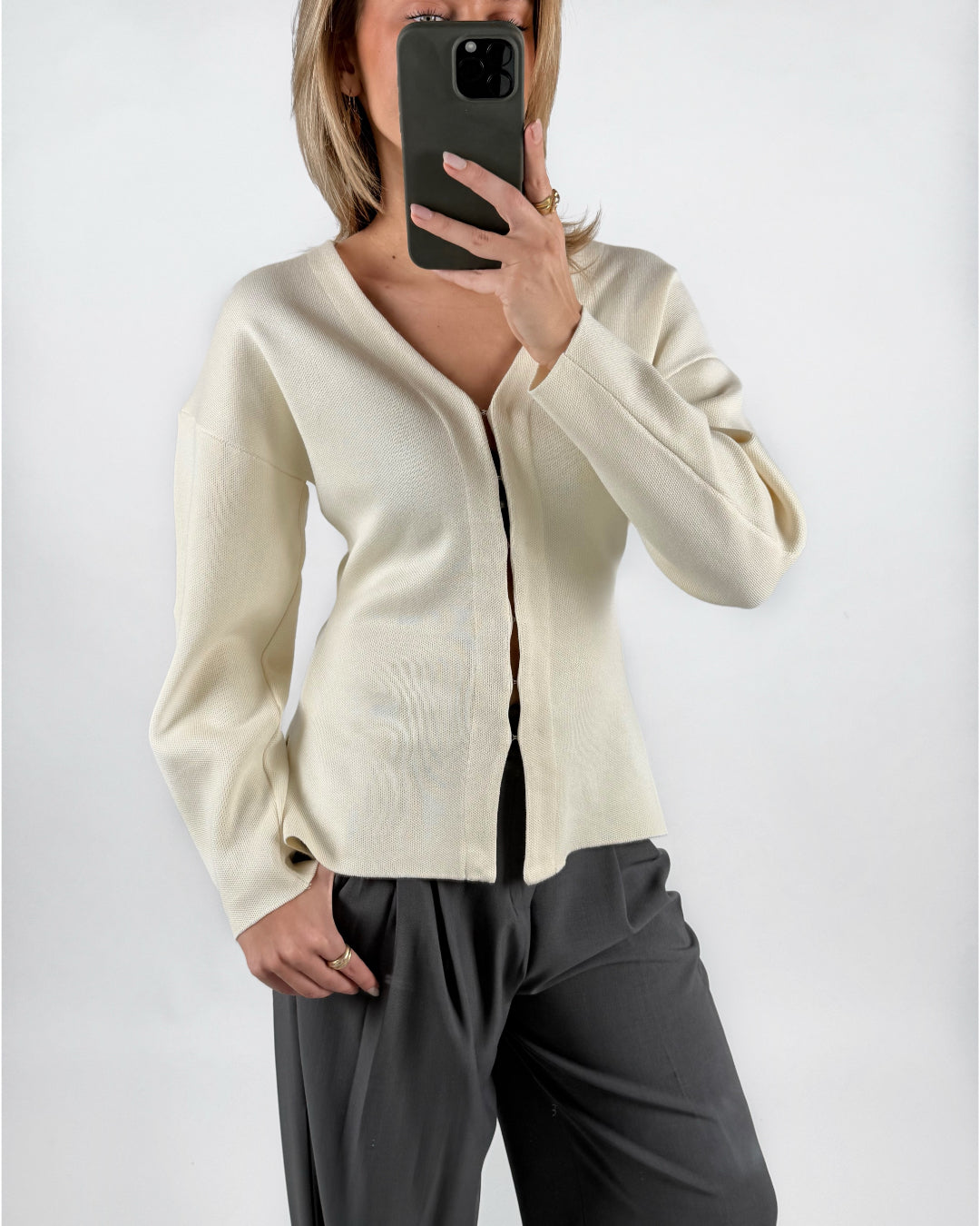 INDY cardigan, creme er en virkelig fin og enkelt cardigan med skjult lukning foran. Den er meget simpel og elegant. Den er faconsyet og kan bruges som en blazer.