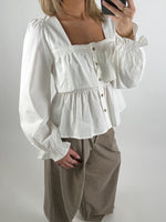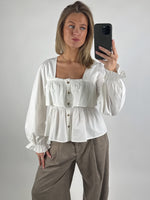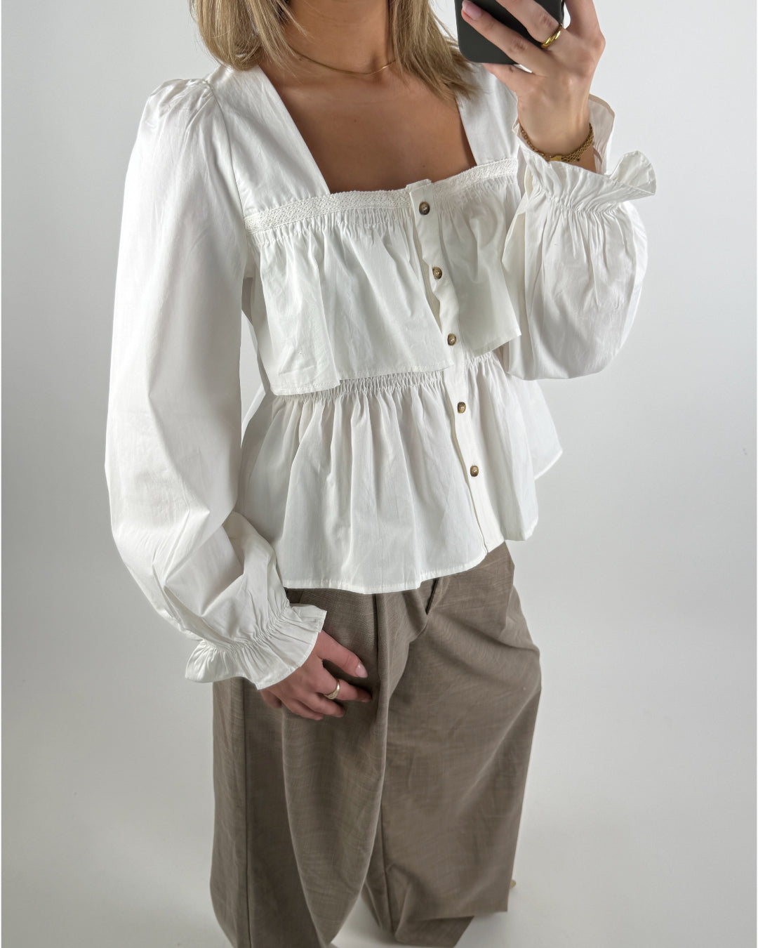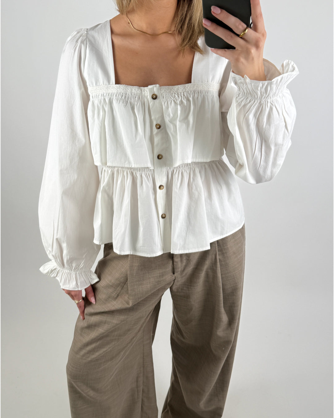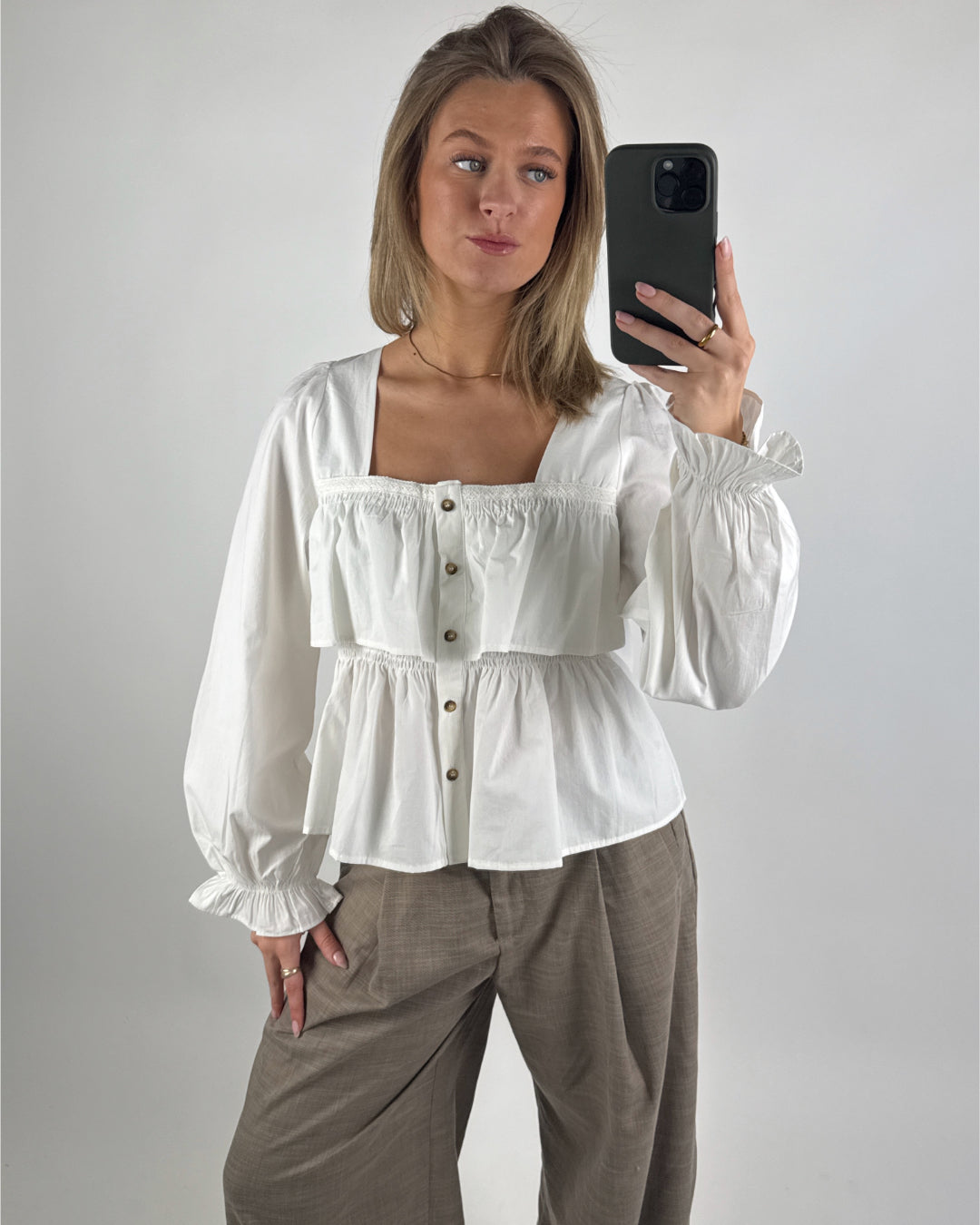 Romantisk og feminin KHLOE flæse bluse, hvid, perfekt til både hverdag og særlige anledninger. Blusen har et flot, firkantet snit ved halsudskæringen og lukkes foran med dekorative knapper. Det dobbelte lag og de fine rynkede detaljer ved bryst og talje giver blusen et let og elegant fald.
