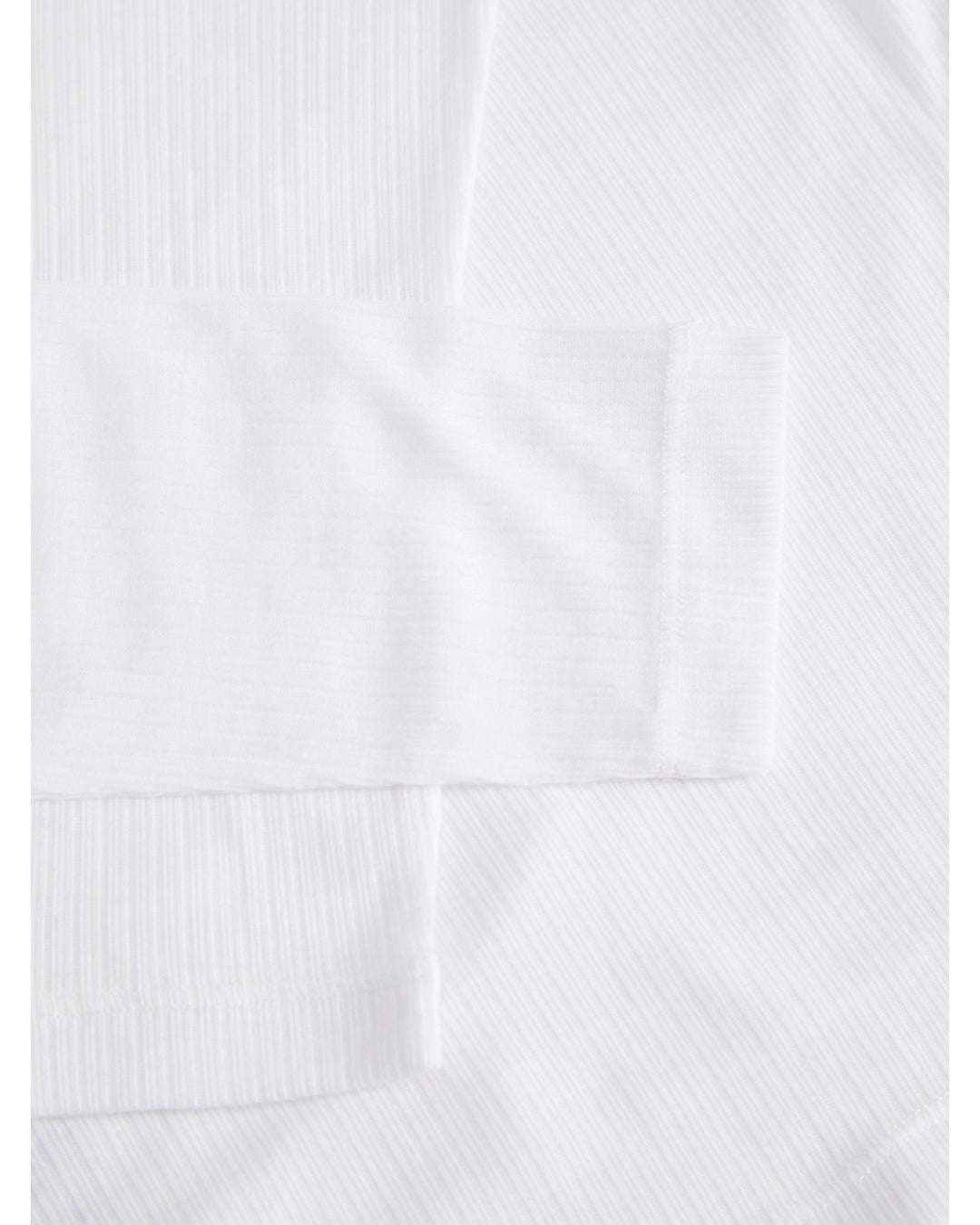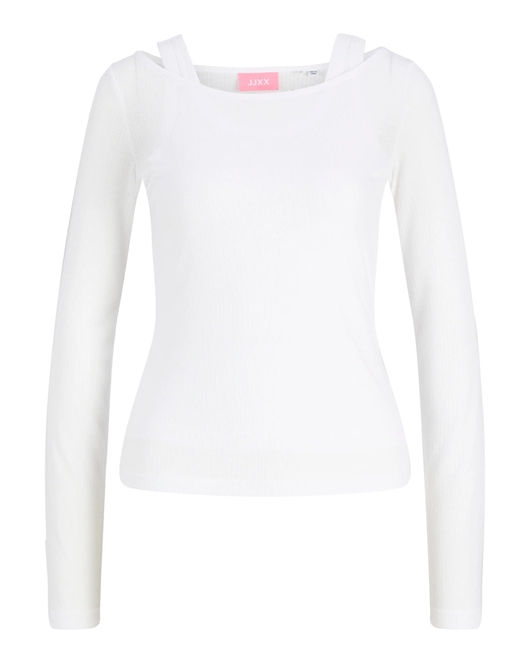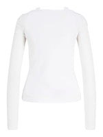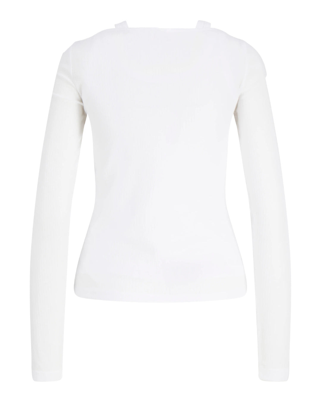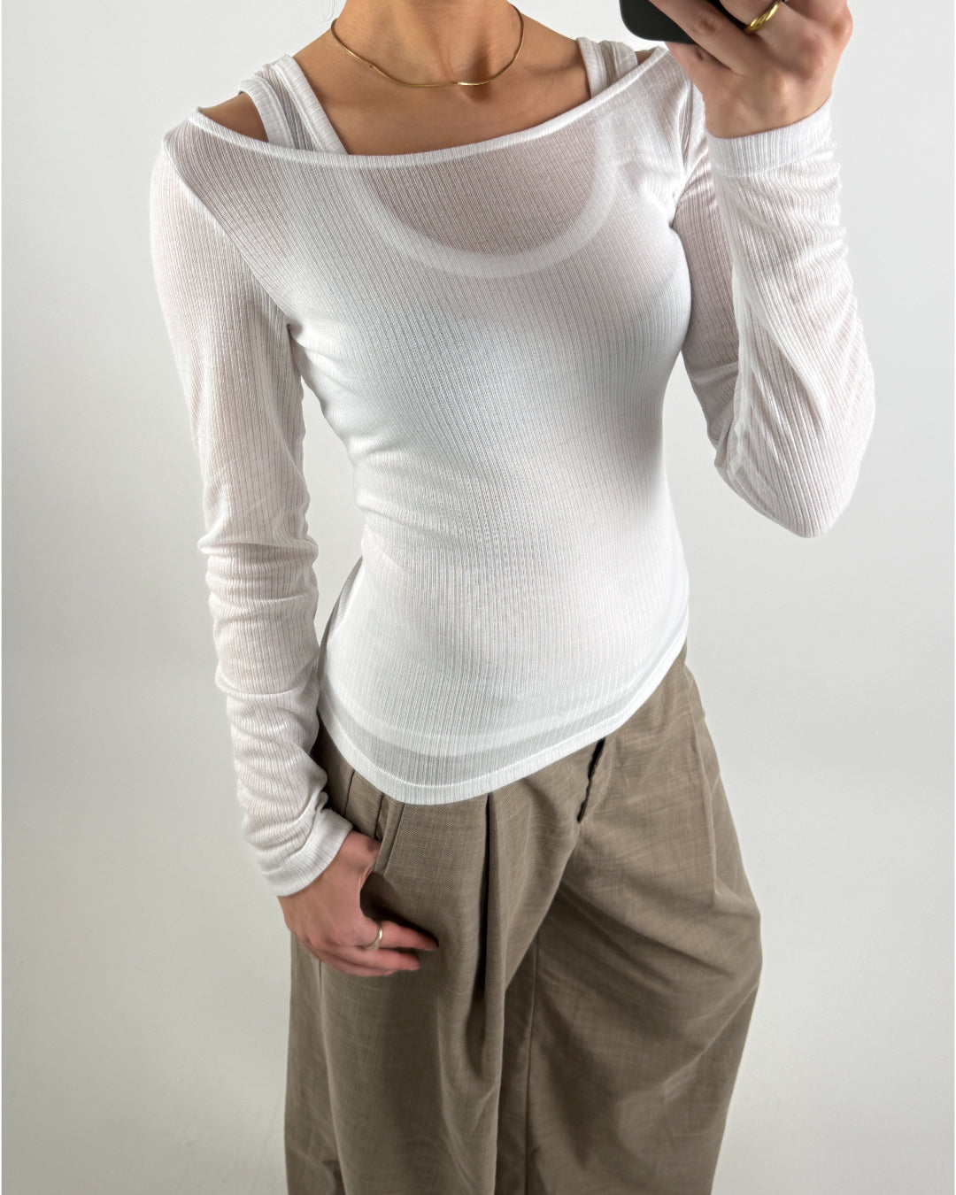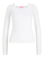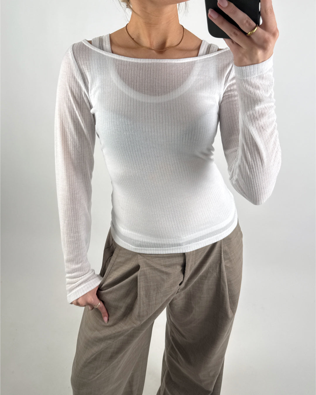 Yderblusen, med bådudkæring, er lavet i let, transparent materiale med smalle ribber og lange ærmer, der tilføjer lethed og et elegant touch til looket.
