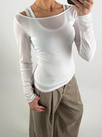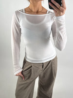 Trendy og moderne LISA bluse, hvid, designet med et lag-på-lag look, hvor den inderste top og yderblusen er syet sammen for en smart 2-i-1 effekt. Inderlaget er en blød tanktop med brede stropper og rund udskæring, der giver en feminin og cool kontrast til det let gennemsigtige yderlag.