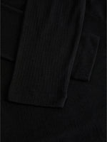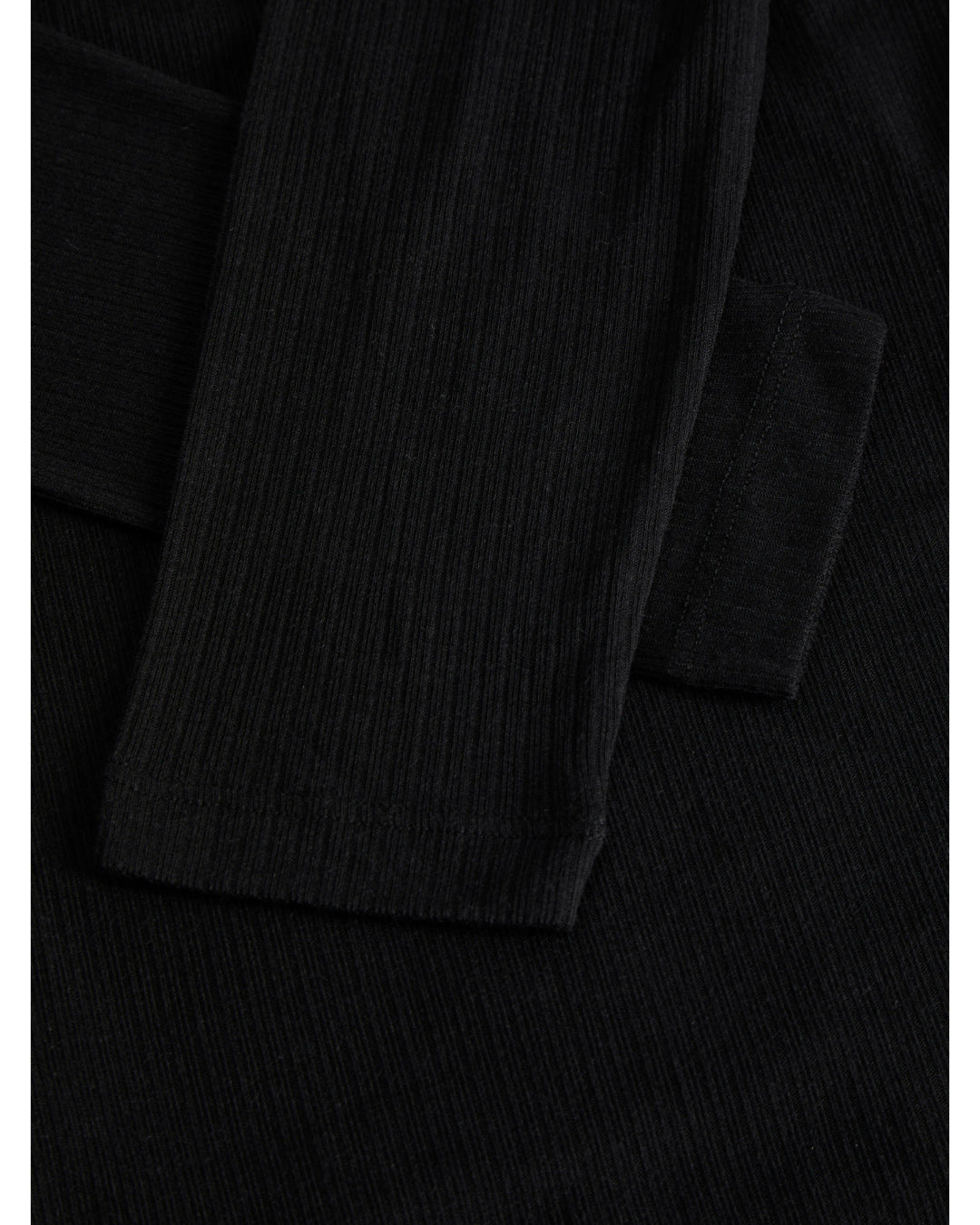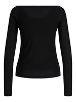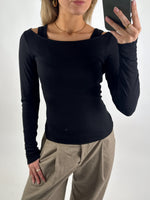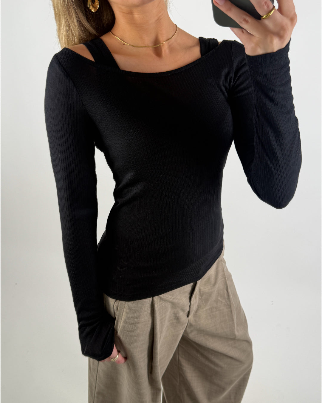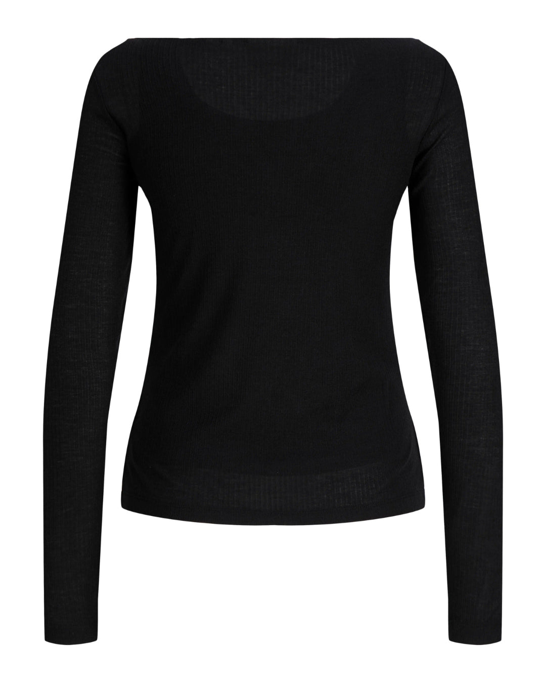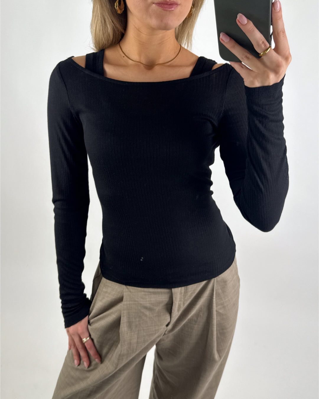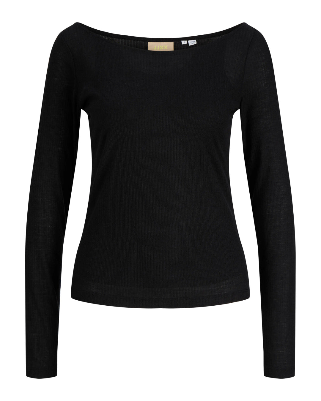 Yderblusen, med bådudkæring, er lavet i let, transparent materiale med smalle ribber og lange ærmer, der tilføjer lethed og et elegant touch til looket.