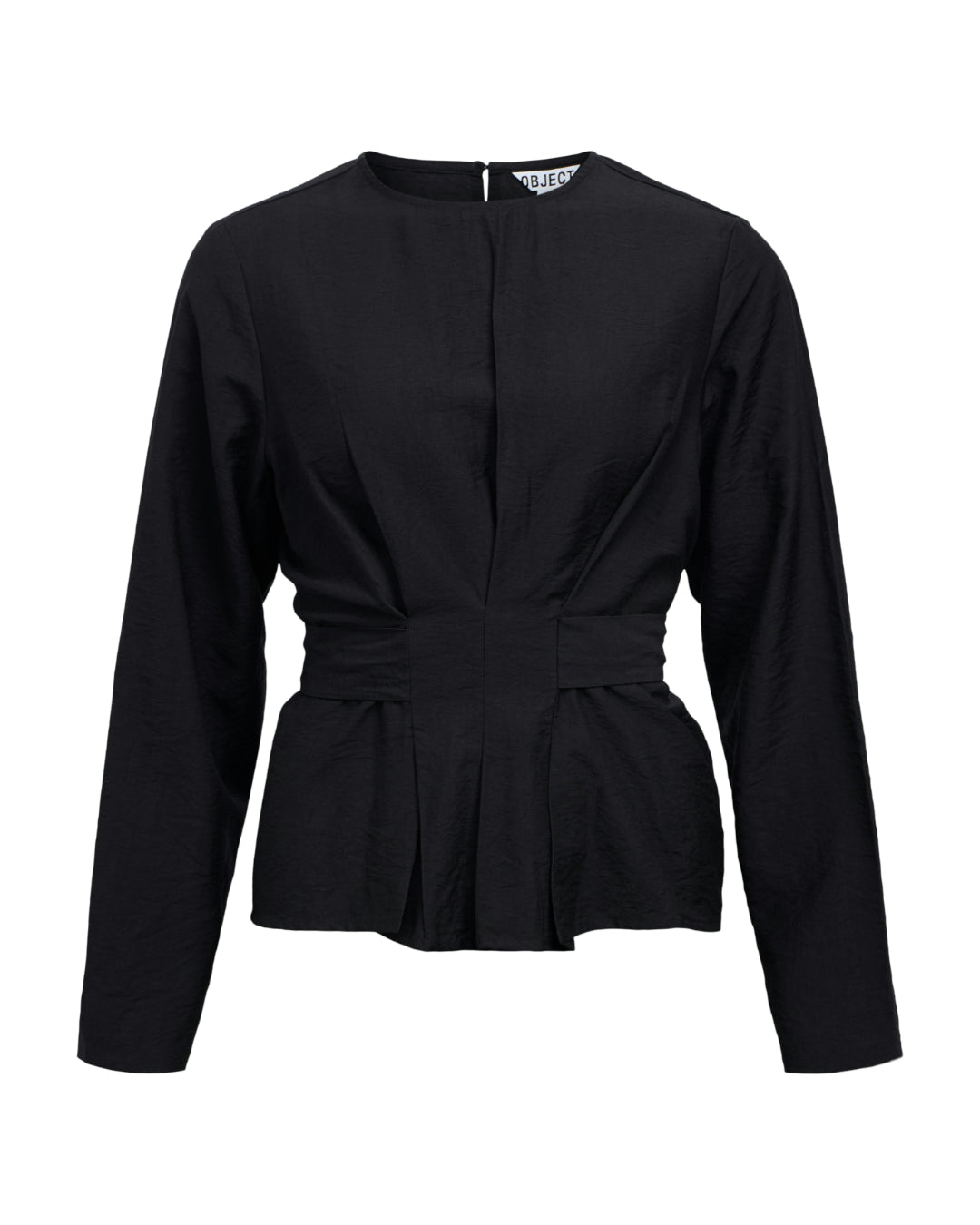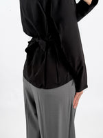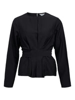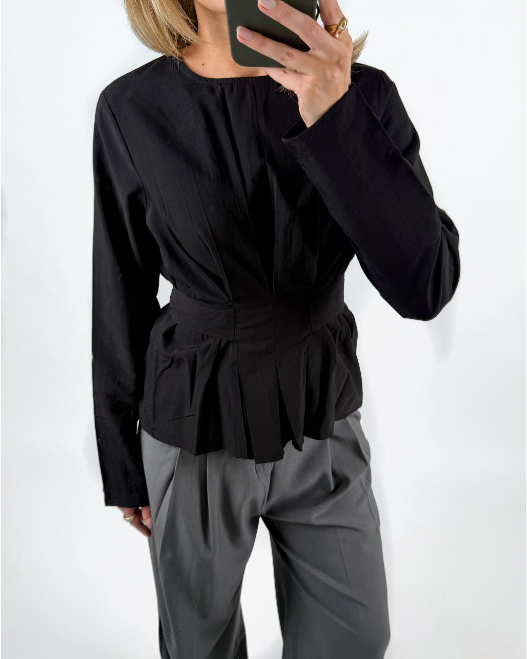 Vores virkelig smukke YUI bluse, sort er så fin og enkelt, dog med en virkelig flot detalje med bindebånd på forsiden. Detaljen giver skjorten figursyet udtryk og viser en fin talje. Skjorten har rund hals og har lukkes med en enkelt lille knap i nakken.