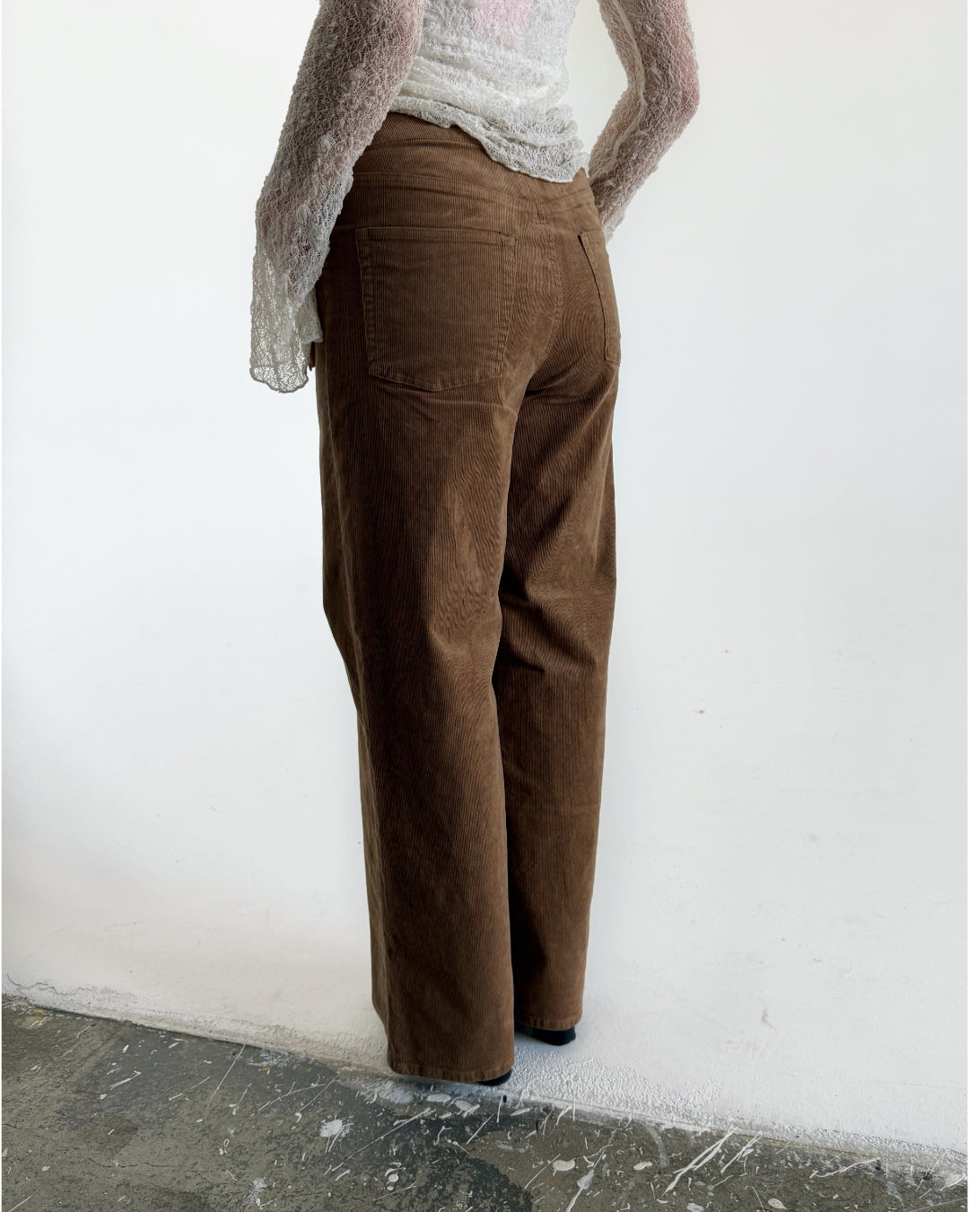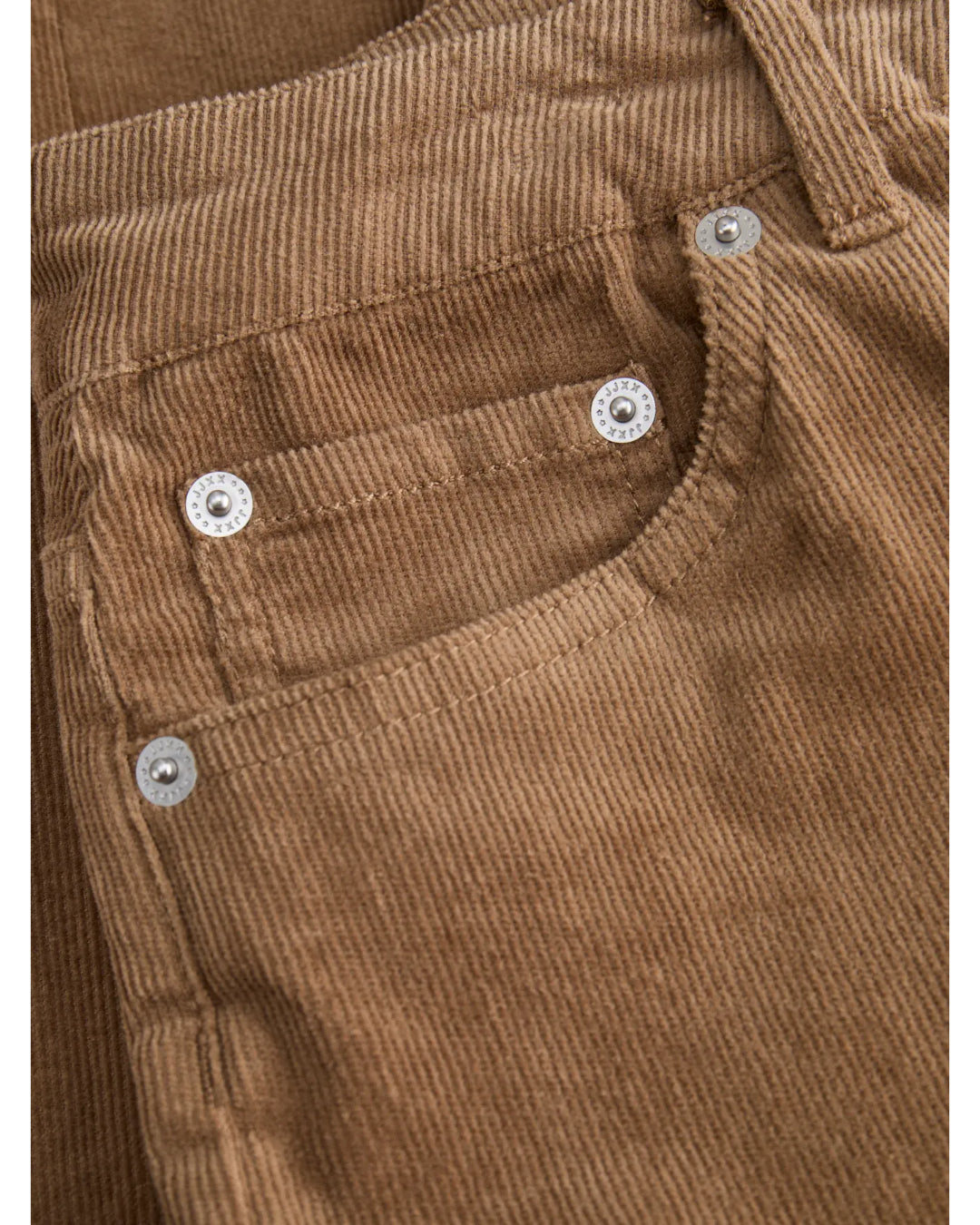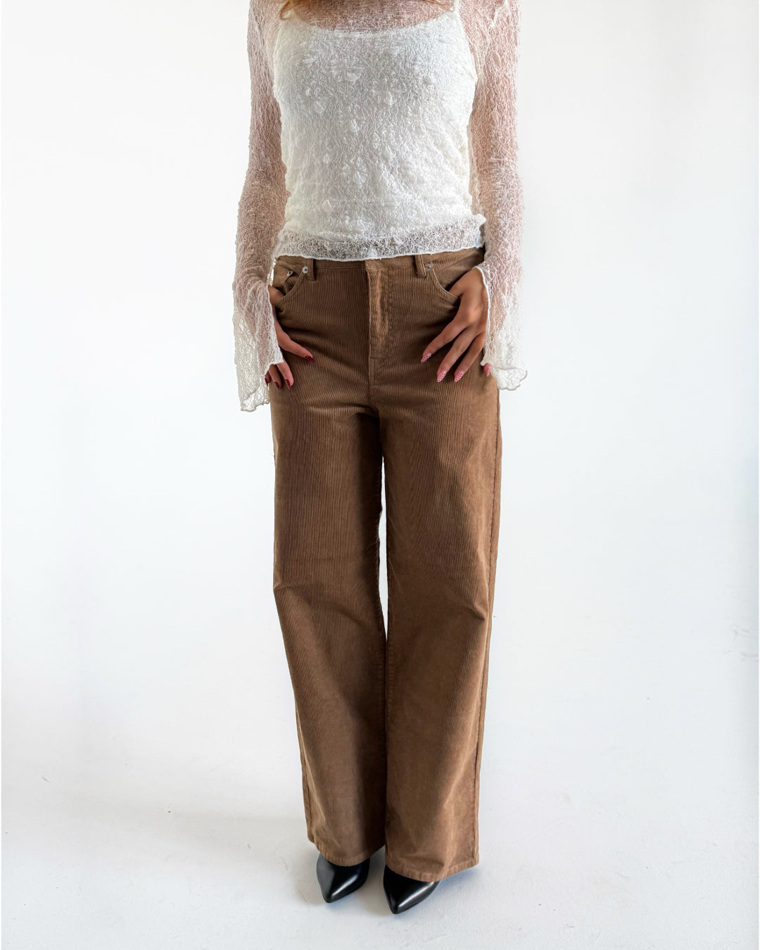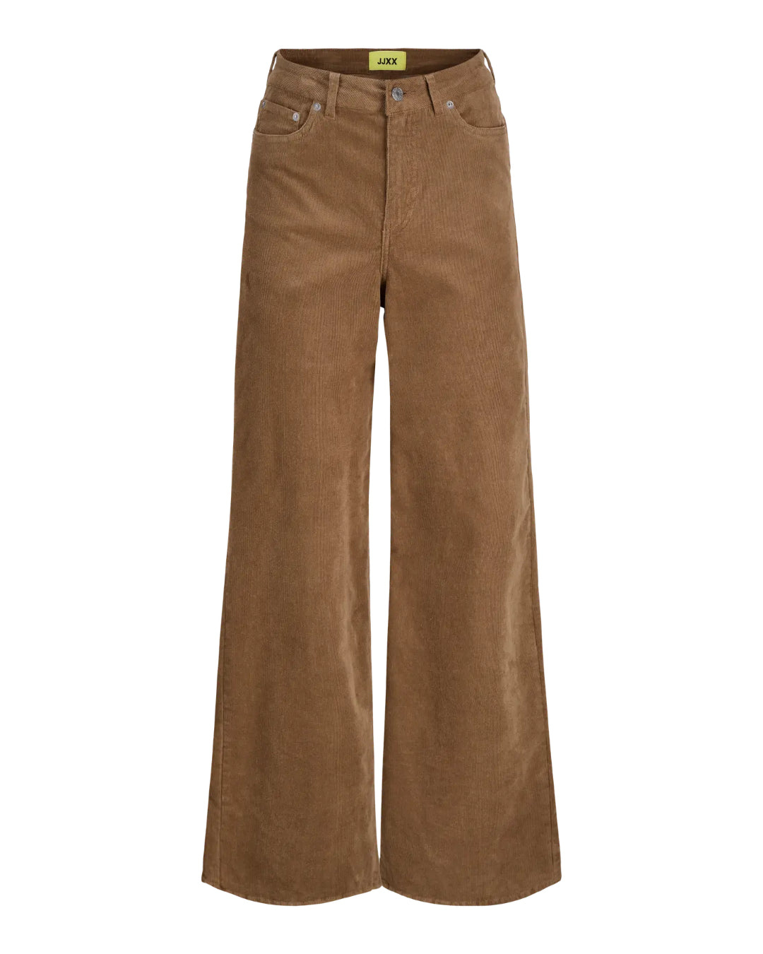 GELLY bukser, brun er de lækreste bukser bestående af corduroy tekstil, som er et ribbet fløjlsagtigt materiale. GELLY bukser, brun har en pasform som er wide leg fit, high waist med bag- og forlommer. Bukserne er både velegnet til hverdags- samt weekendbrug.