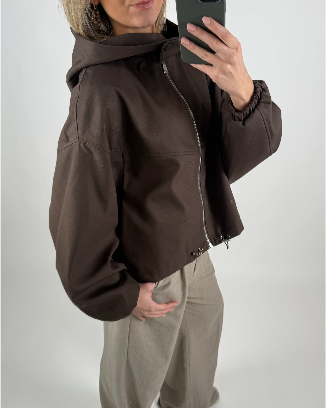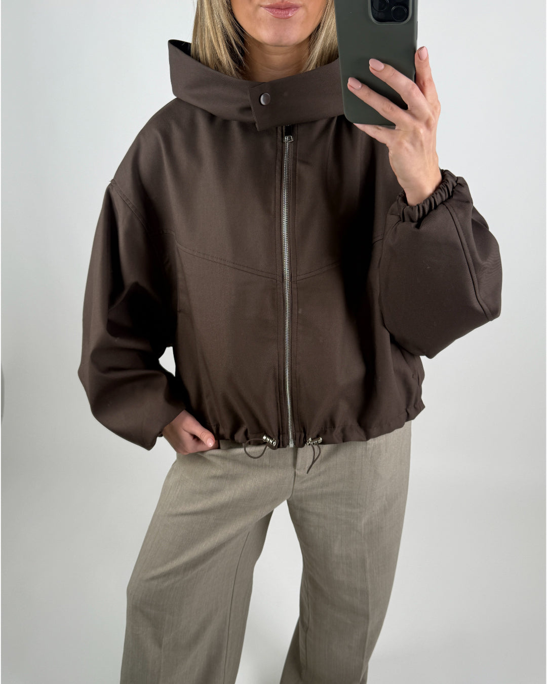 Nederst er der snøre, som gør det muligt at tilpasse pasformen og fremhæve taljen. Ærmerne er løstsiddende med elastik ved håndleddene, hvilket giver ekstra komfort og bevægelsesfrihed. Stoffet er let og åndbart – perfekt til overgangsvejr, forår eller efterår.