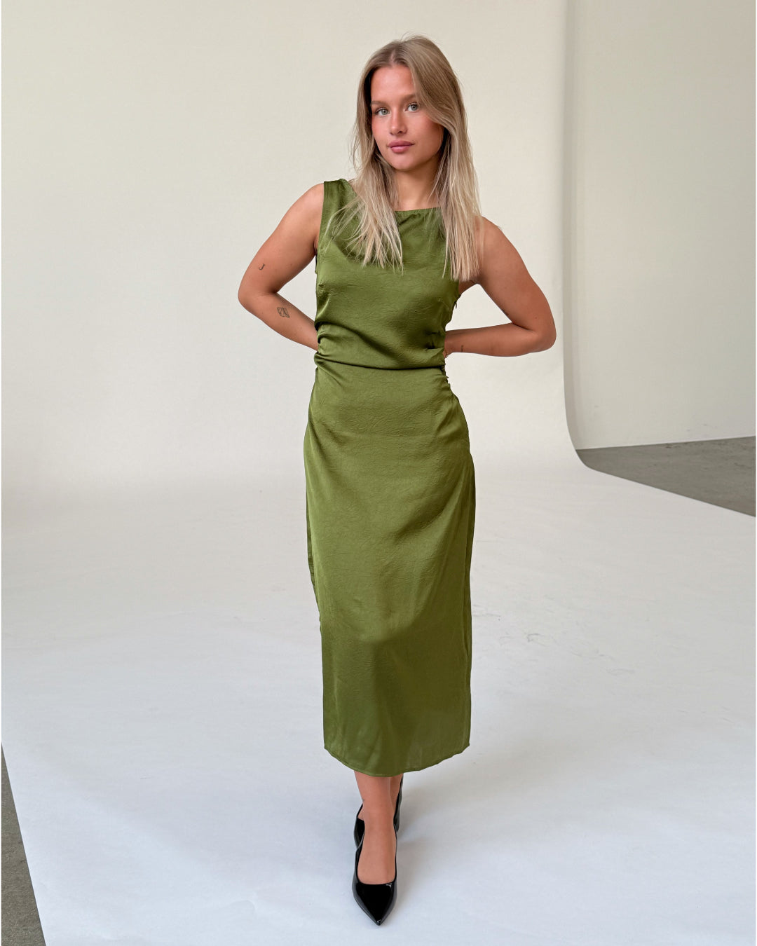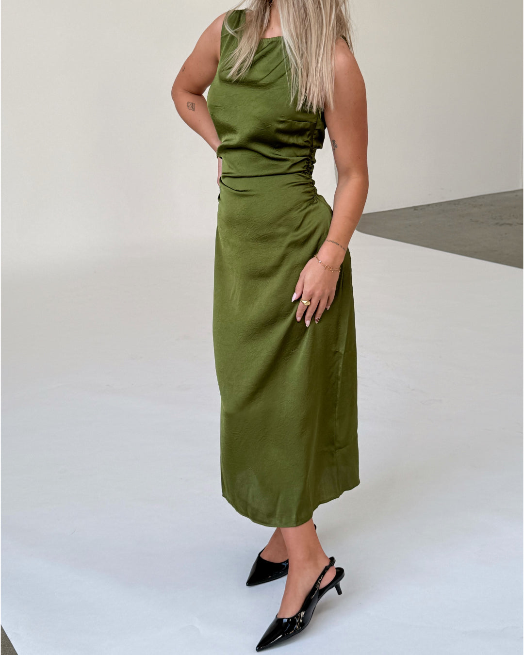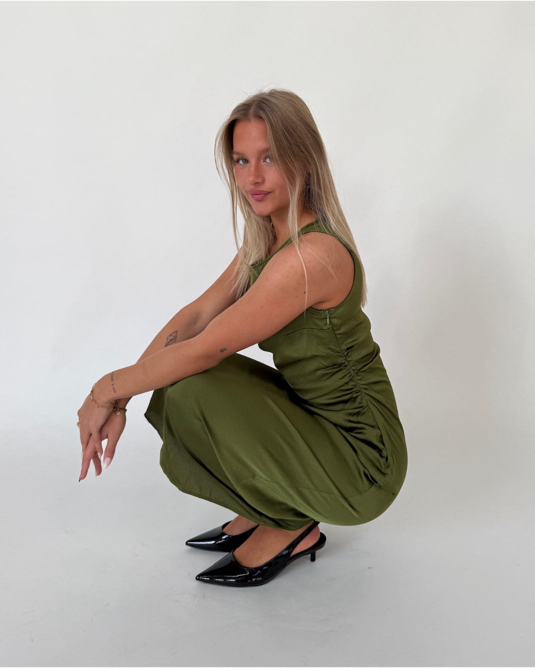 JANE kjole, grøn er lavet i det flotteste satin lignende materiale og har de fineste detaljer. Kjolen har en lukket ryg med skjult lynlås i den ene side.