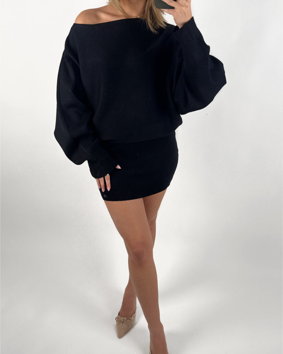 Modelbillede af sort XANDRA kjole med lange ærmer og bare skuldre. Set forfra. Fra BySofieSønderby