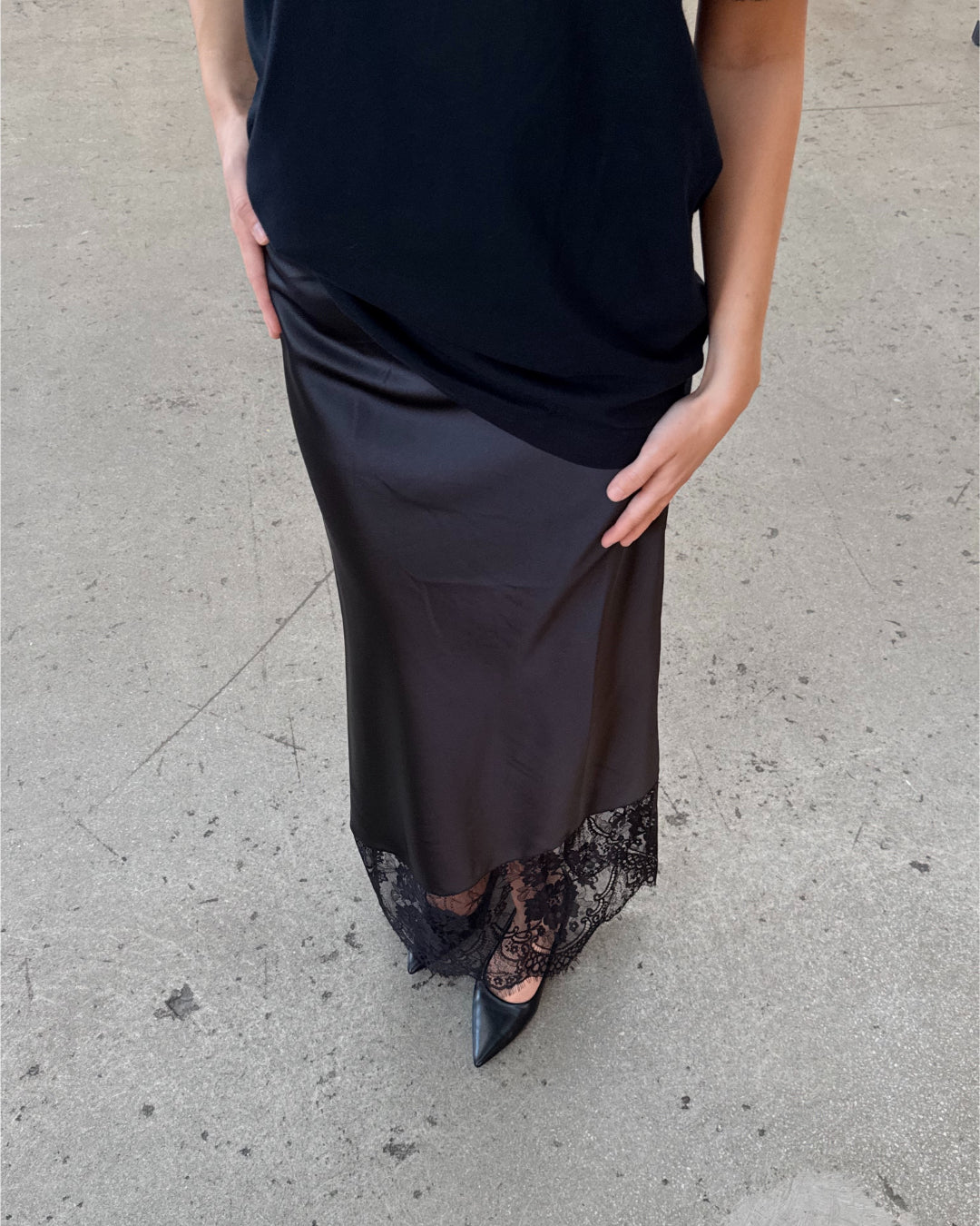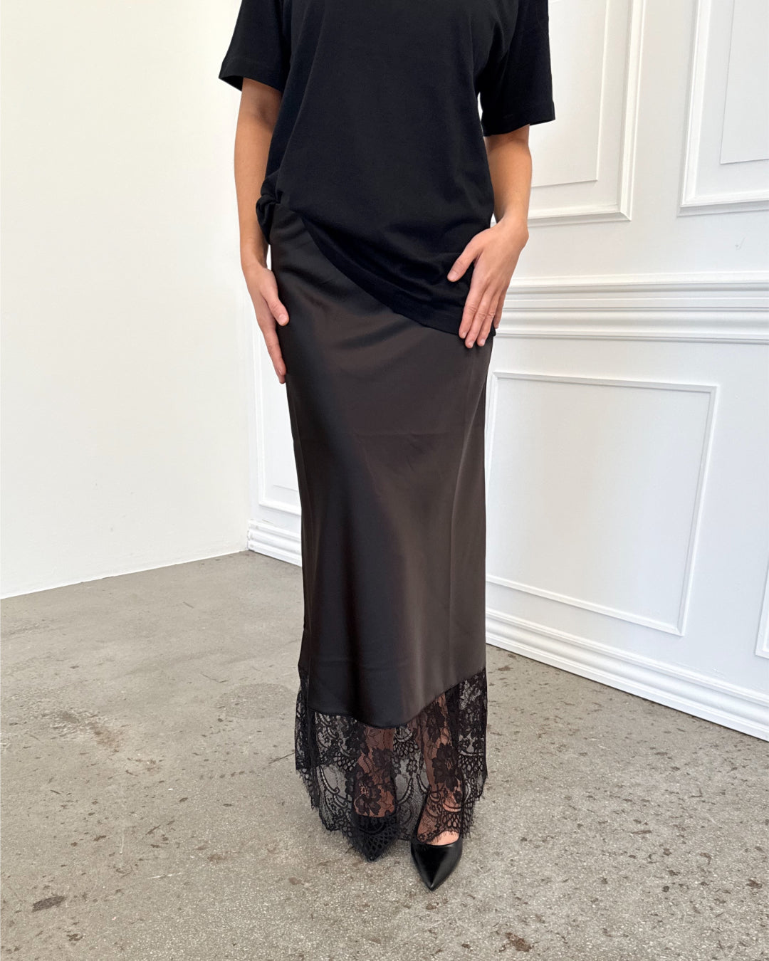 Vores smukke BILLIE blondenederdel, sort er den perfekte A formede nederdel. Nederdelen er i et løst materiale, med en smuk blondekant forneden.