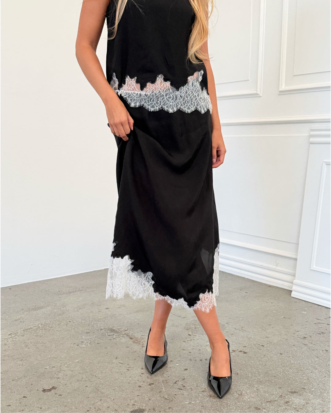 Vores meget fine DALME blonde nederdel, sort er et virkelig godt forslag til det perfekte look til julefrokosten eller nytår. Nederdelen er i et løst materiale, med en smuk hvid blondekant forneden. Den har en matchende top, som også kan findes i webshoppen