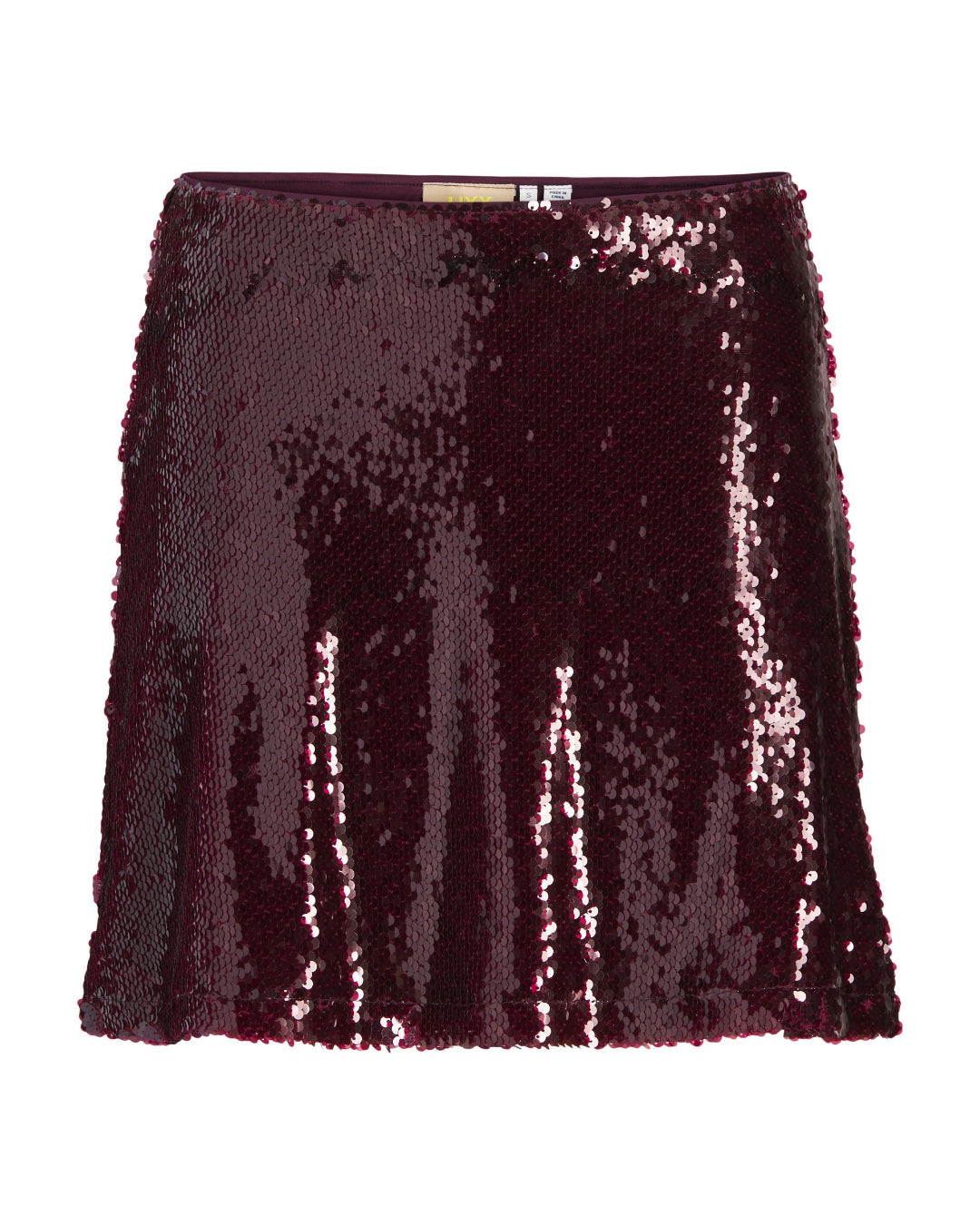 SIA paillet nederdel, bordeaux er en kort nederdel, som har en bred elastik i taljen.