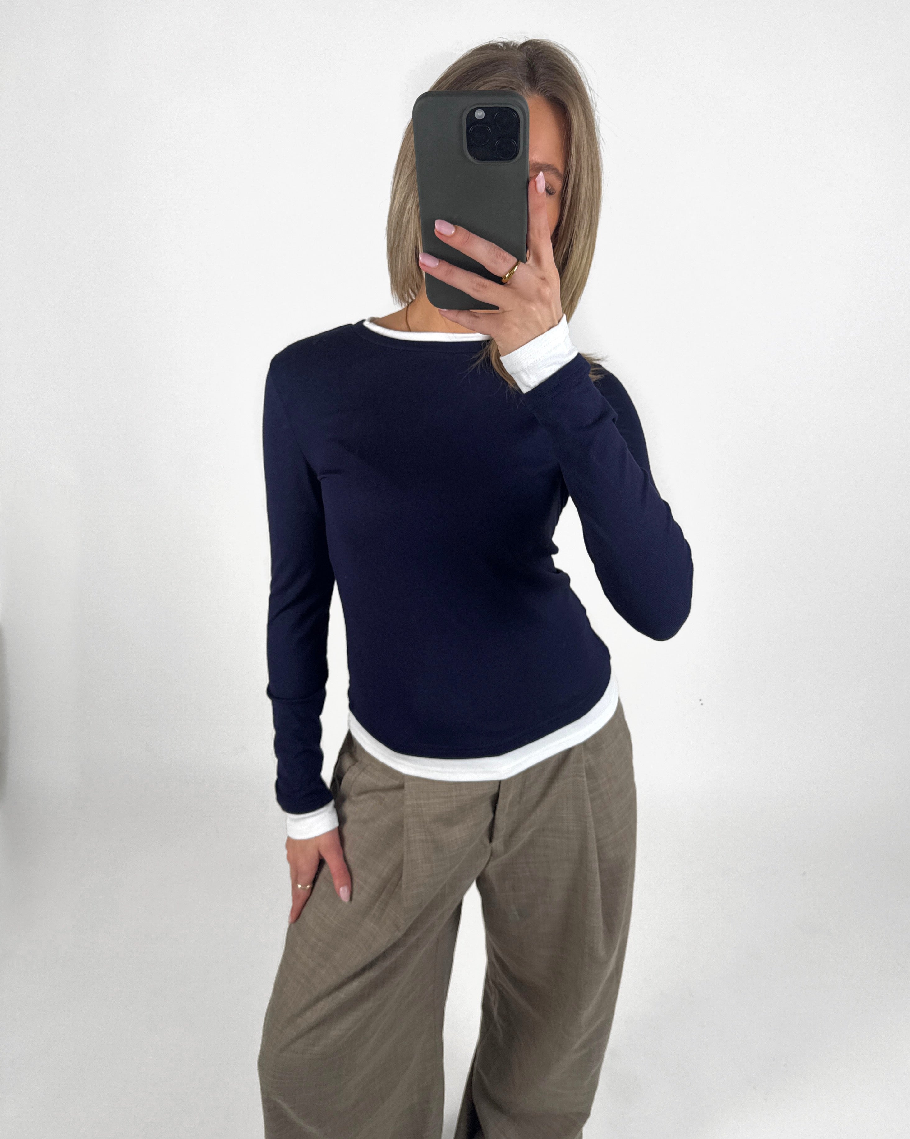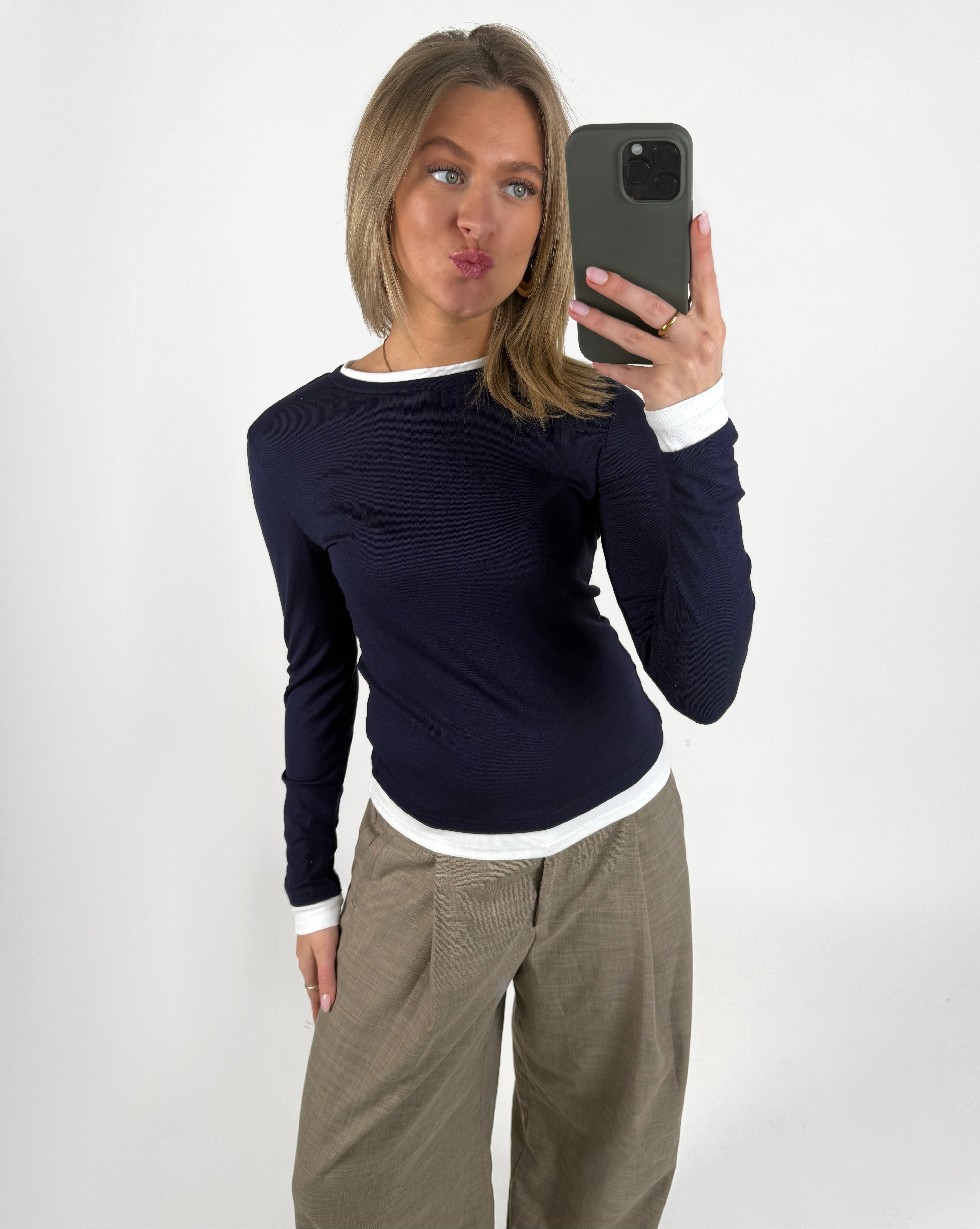 Den smukke EVIE langærmet, navy er den perfekte tætsiddende langærmede t-shirt. T-shirten har det cool dobbelt t-shirt look, da det ligner der er en trøje inde under.