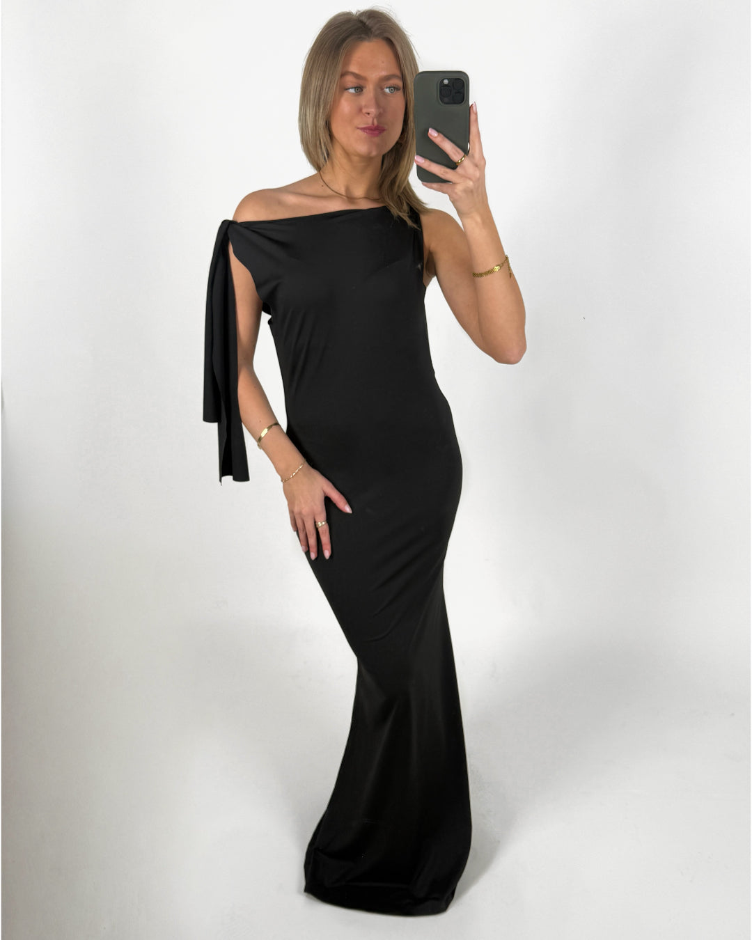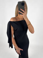 LILJA maxi kjole, sort har flere smukke detaljer som båd udskæring, rynkeeffekt og bindebånd ved skulder som pynt. De bare arme og skuldre giver et flot udtryk.