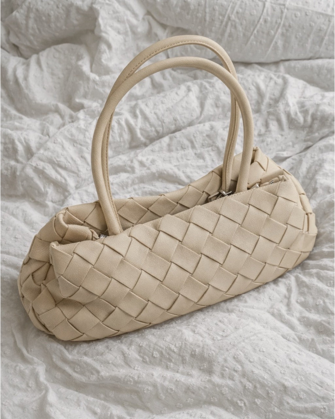 Denne RASMINE taske, beige lavet i fint bredt flettet skindlignende PU materiale. Den har et rummeligt hovedrum med lynlås, to mindre lommer med lynlås og et lille adskilt rum. Tasken er alsidig og kan indeholde virkelig meget. De flere små rum gør det nemt at holde orden i tasken, hvilket gør den ideel som hverdagstaske.