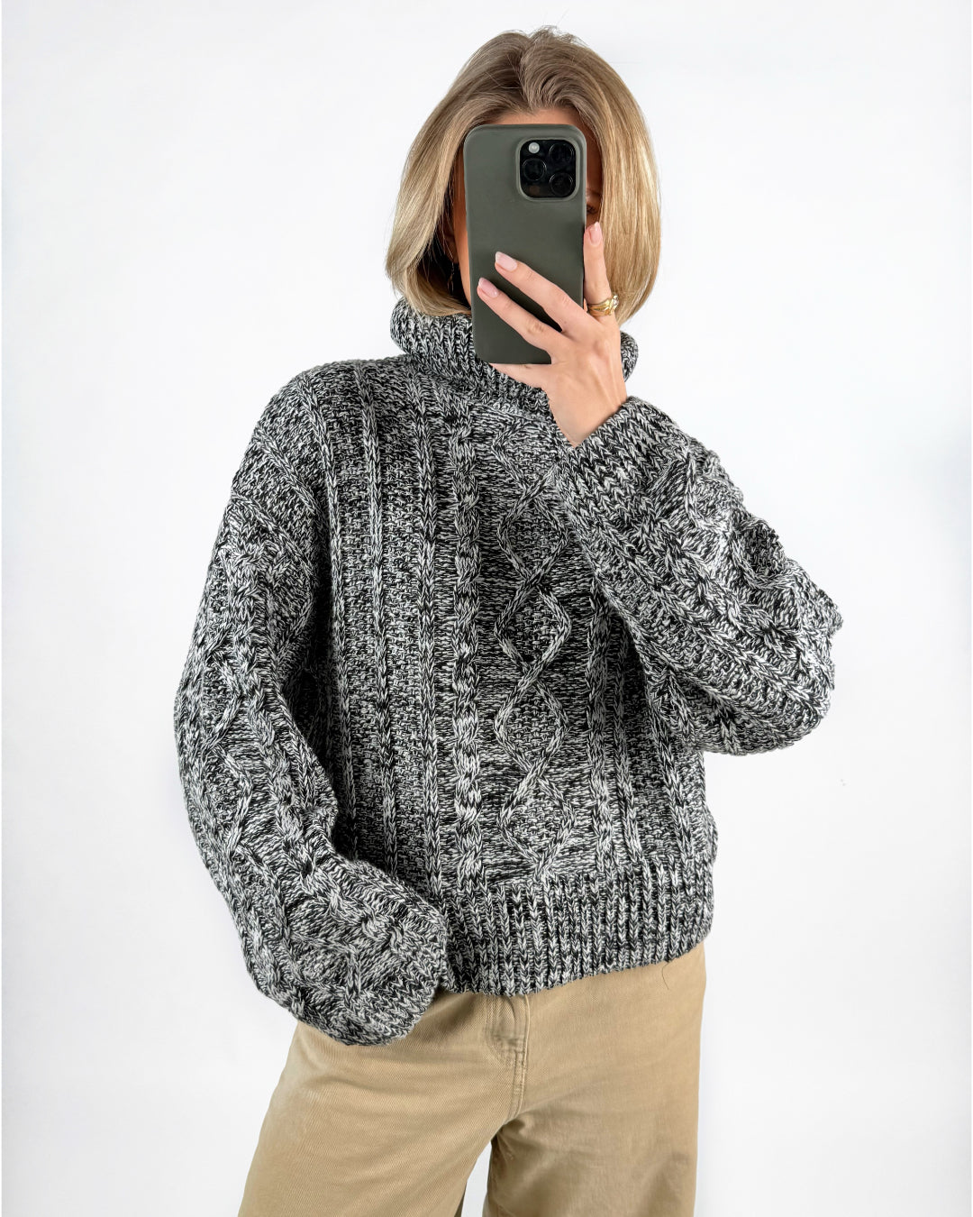 SIMIK rullekrave strik, sort/hvid er en perfekt basic at have i garderoben. Den er en lækker og chunky kabelstrik og med rullekrave. Striktrøjen er langærmet, og i et strækbart materiale.