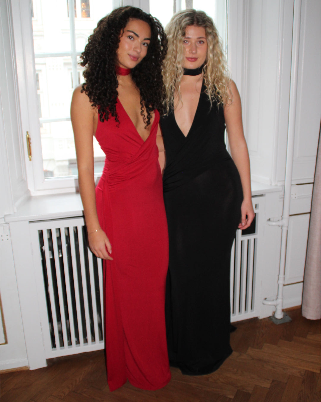 Modelbillede af rød KATYA maxi kjole. Set forfra. Fra BySofieSønderby
