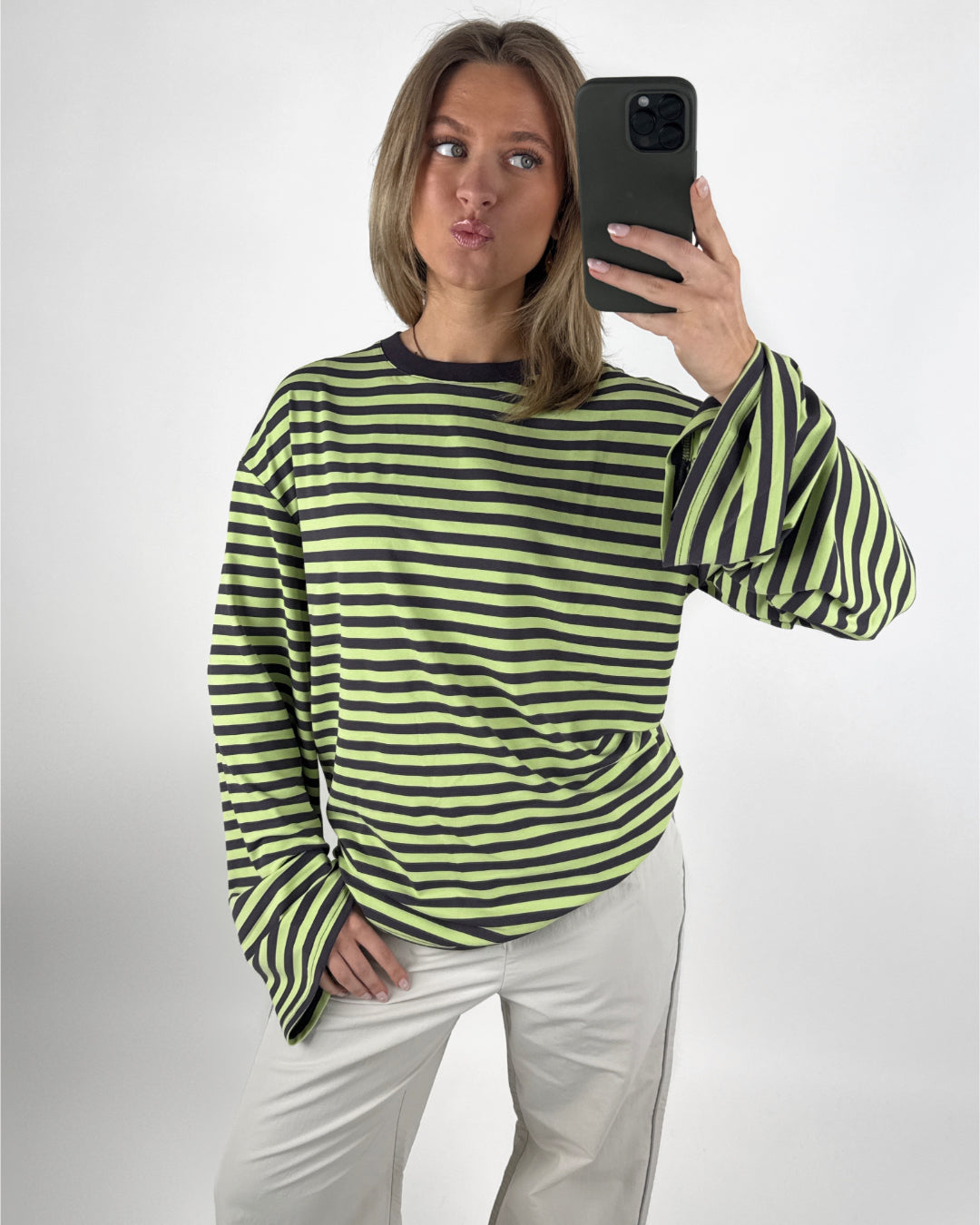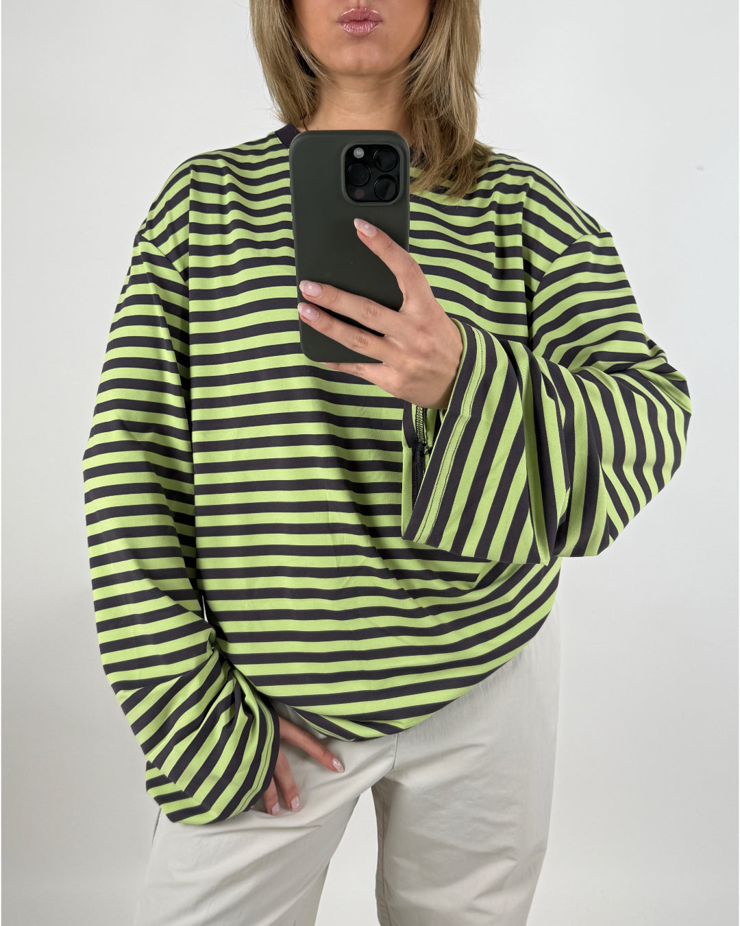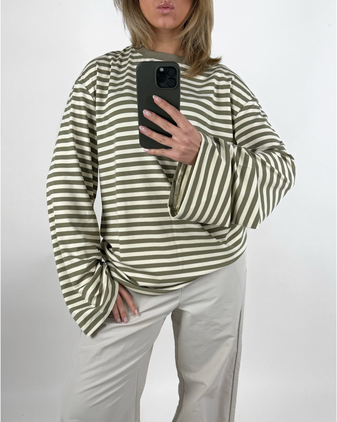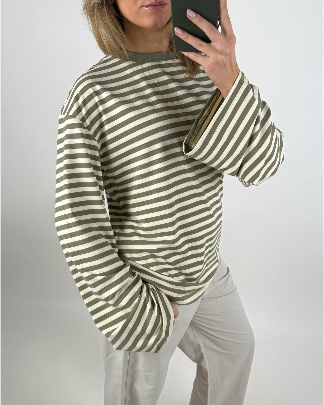 BIANCA oversized stribet long sleeve, army/hvid