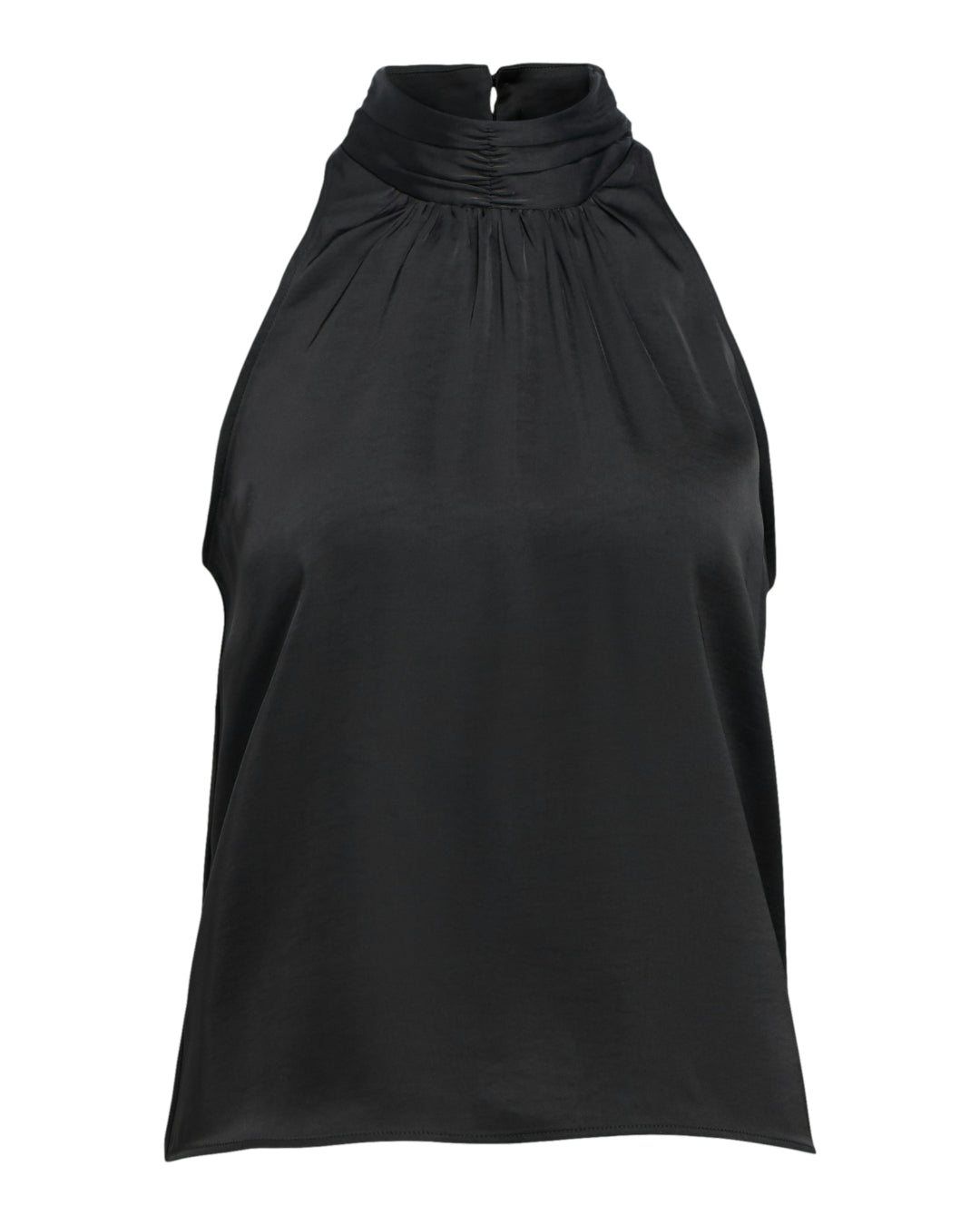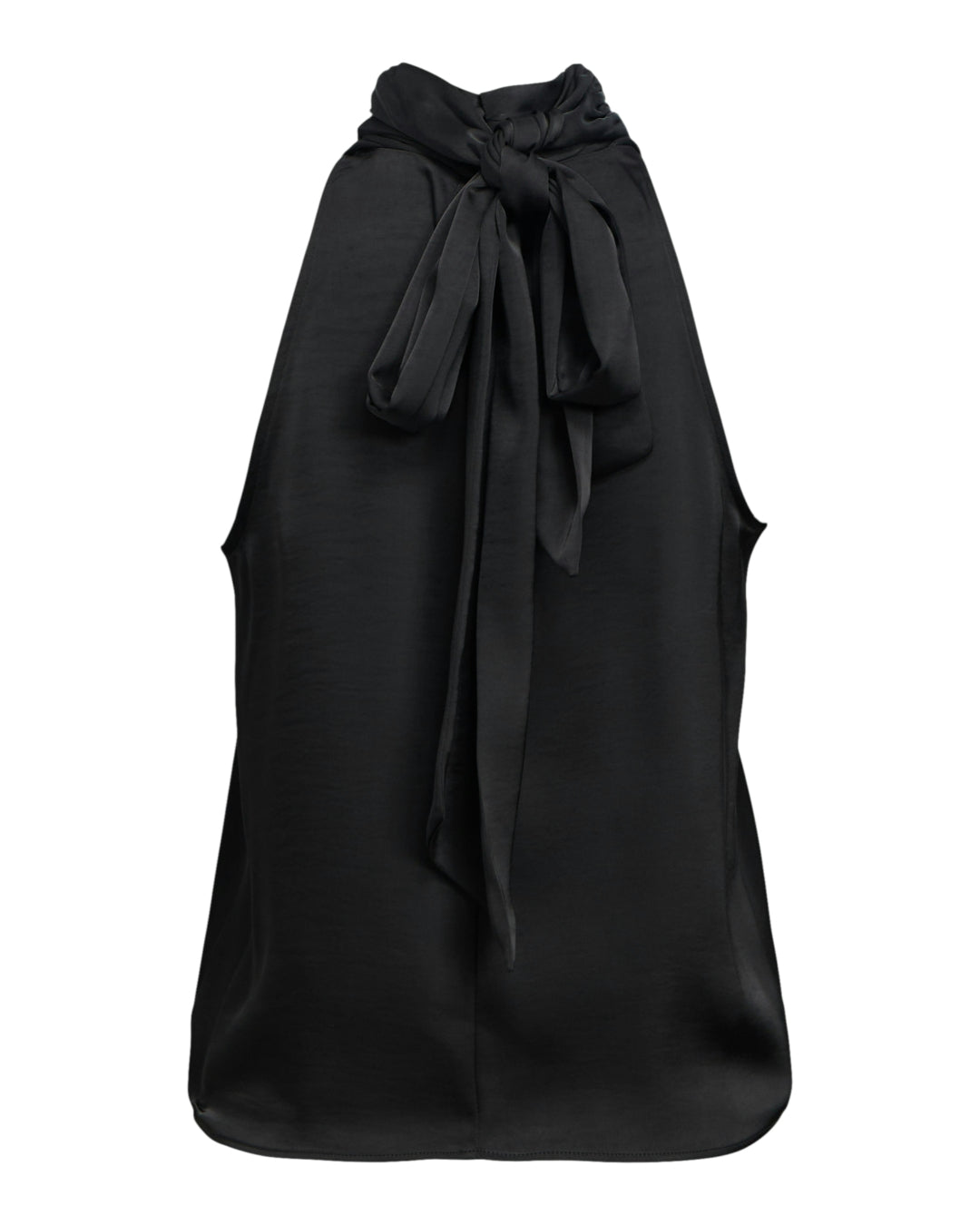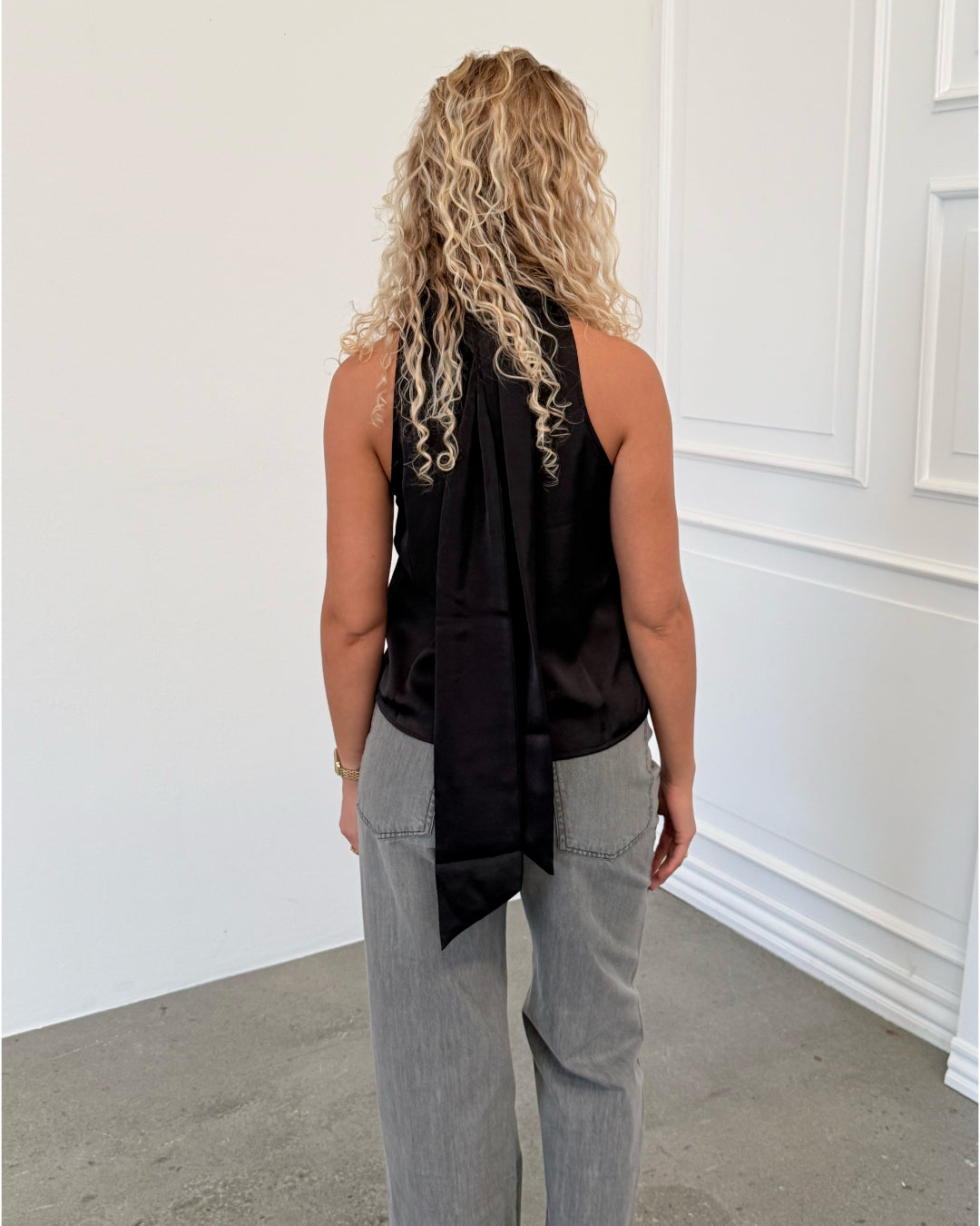 Den meget smukke CHILLI top, sort er sød og smuk med sine fine detaljer. Toppen er i et simpelt stof. Toppen er med bare skuldre og skal bindes i nakken.