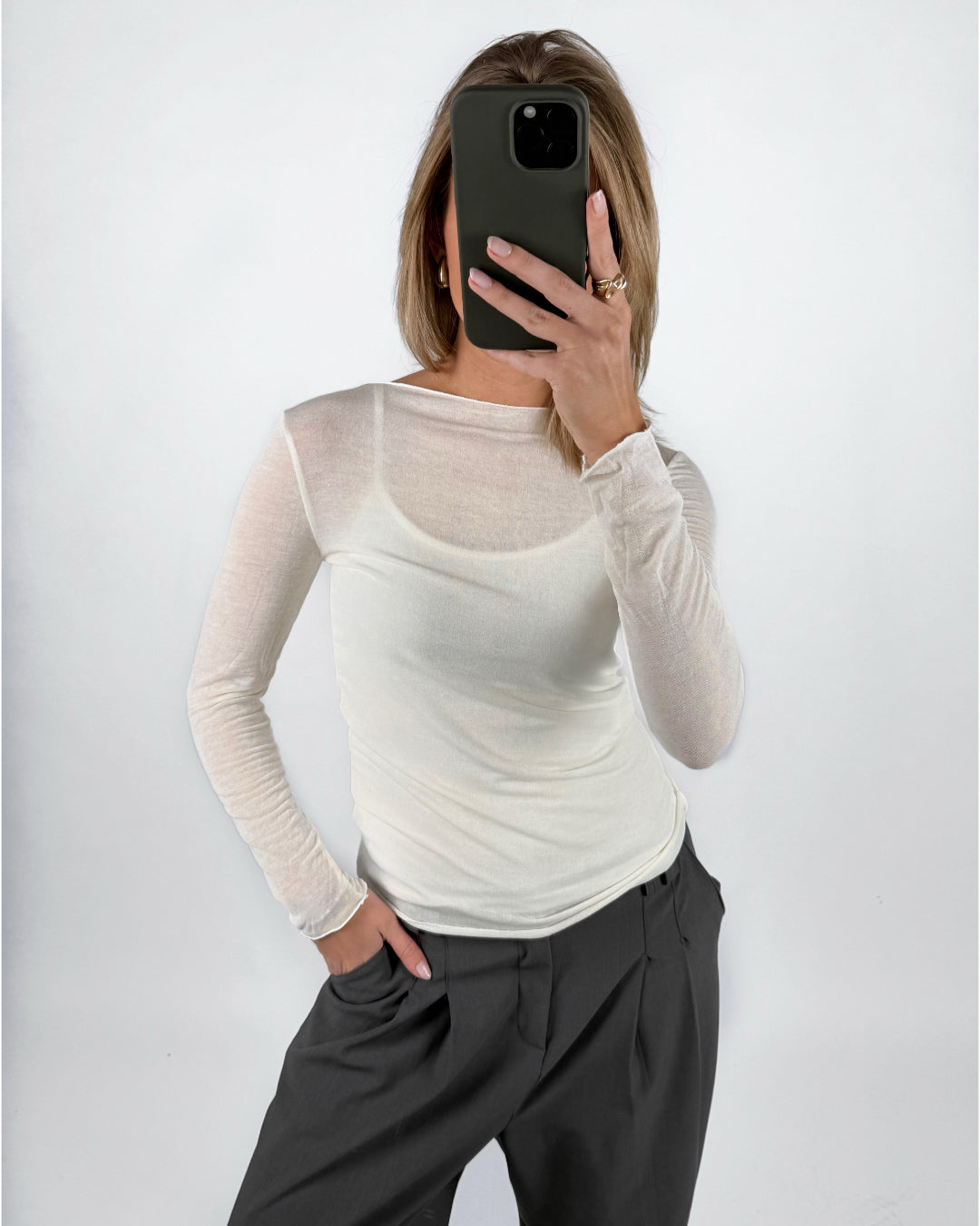 – Langærmet tætsiddende bluse.