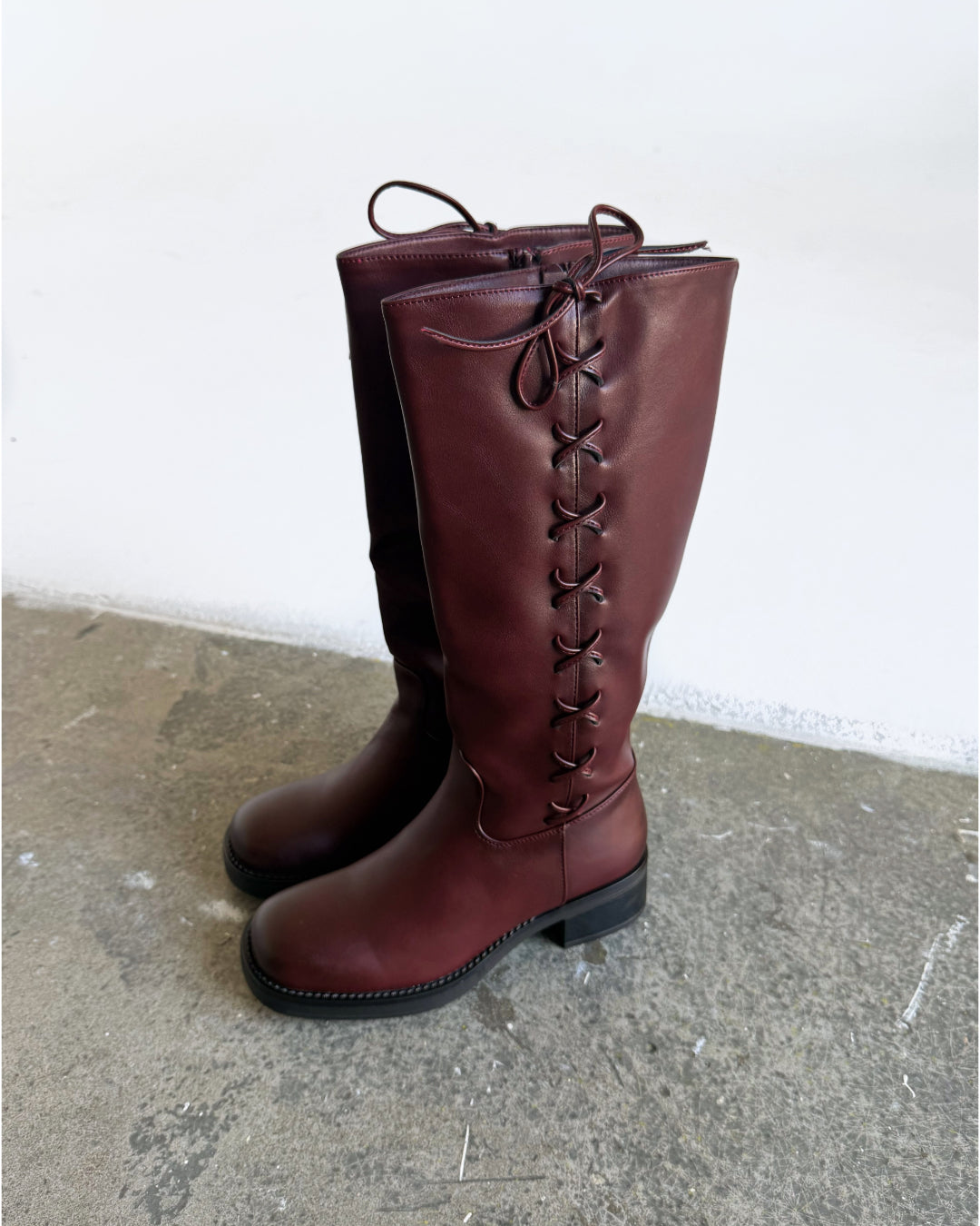 De lækre KIMBER støvler, bordeaux er en høj støvle. De har en fed detalje med snører på siden af støvlen, hvilket giver et lækkert og anderledes look.