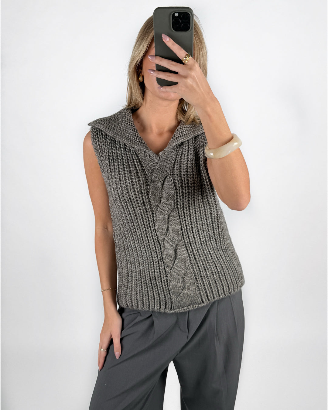 OCEAN strikket vest, grå er den smukkeste og blødeste strik vest med stor krave. Vesten med den voluminøse krave har V hals.