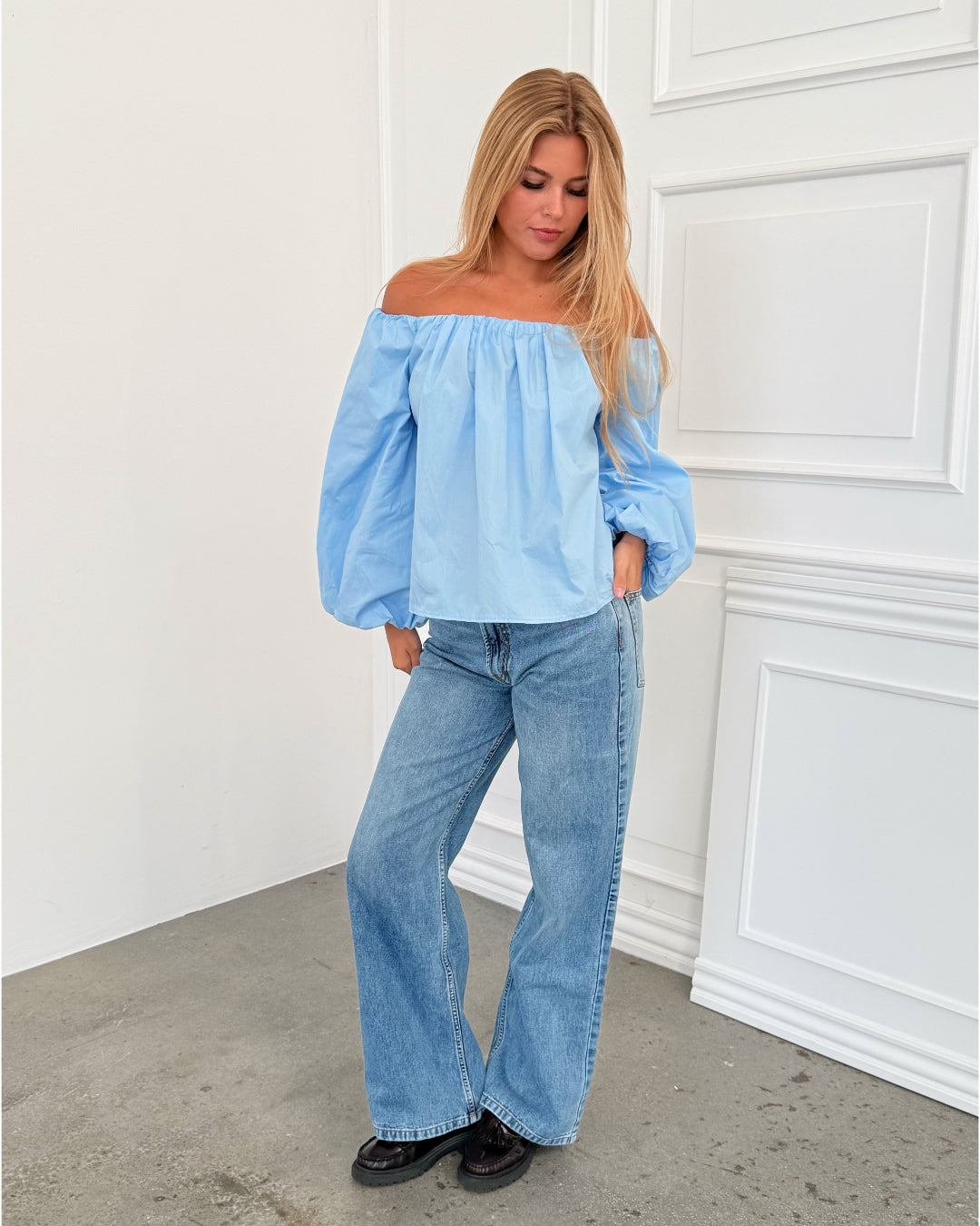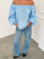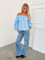 Den smukke ESTELLE off shoulder bluse, blå er nu landet på shoppen. Toppen har et off shoulder look, med smukke lange ballonærmer.