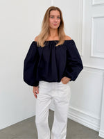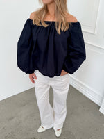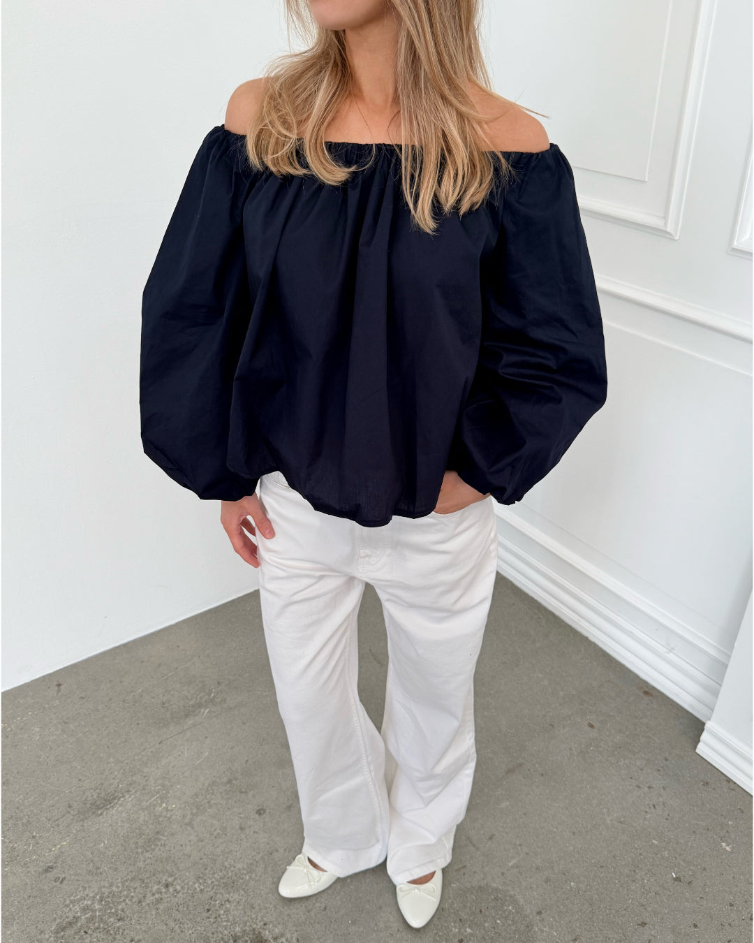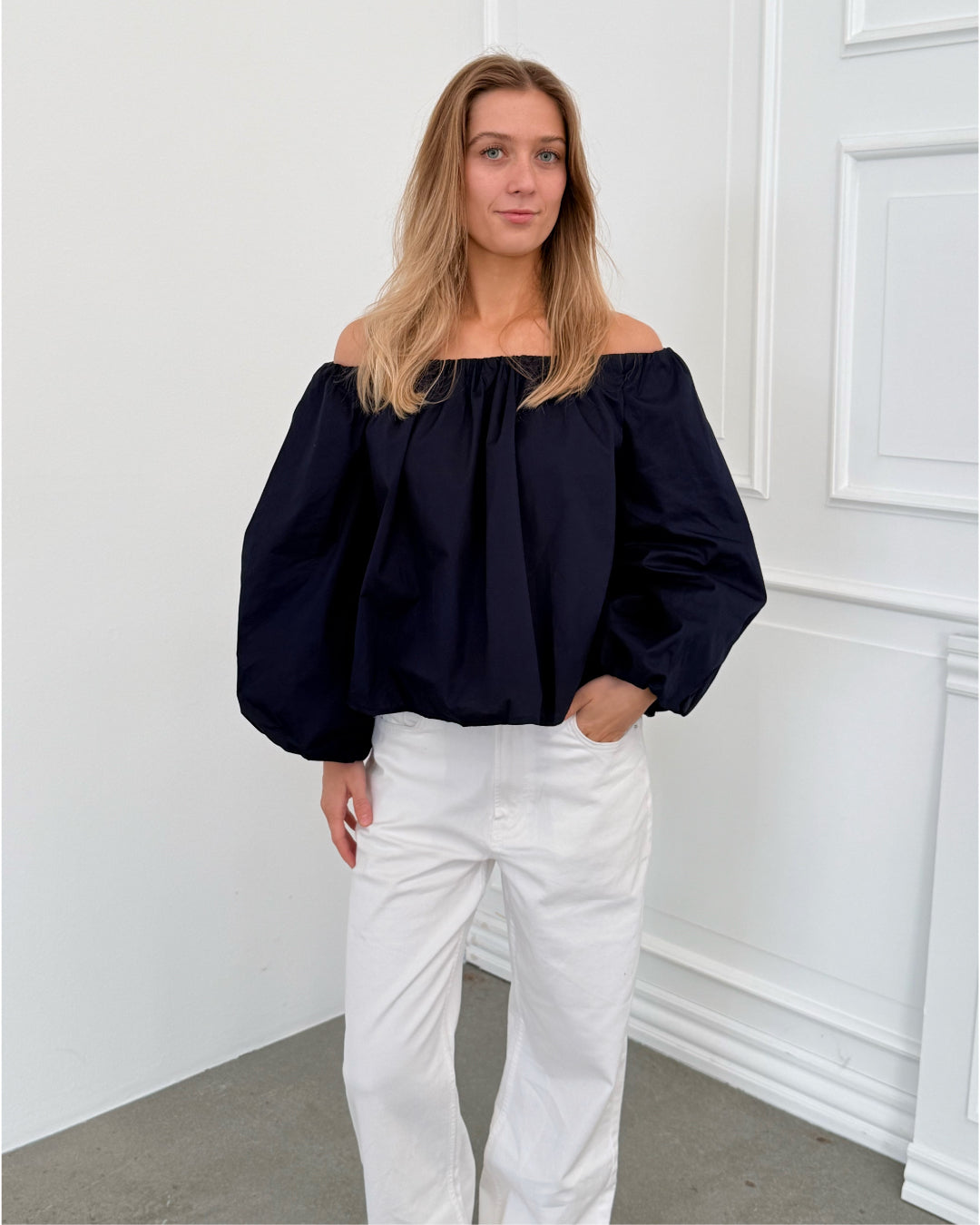 Den smukke ESTELLE off shoulder bluse, navy er nu landet på shoppen. Toppen har et off shoulder look, med smukke lange ballonærmer.