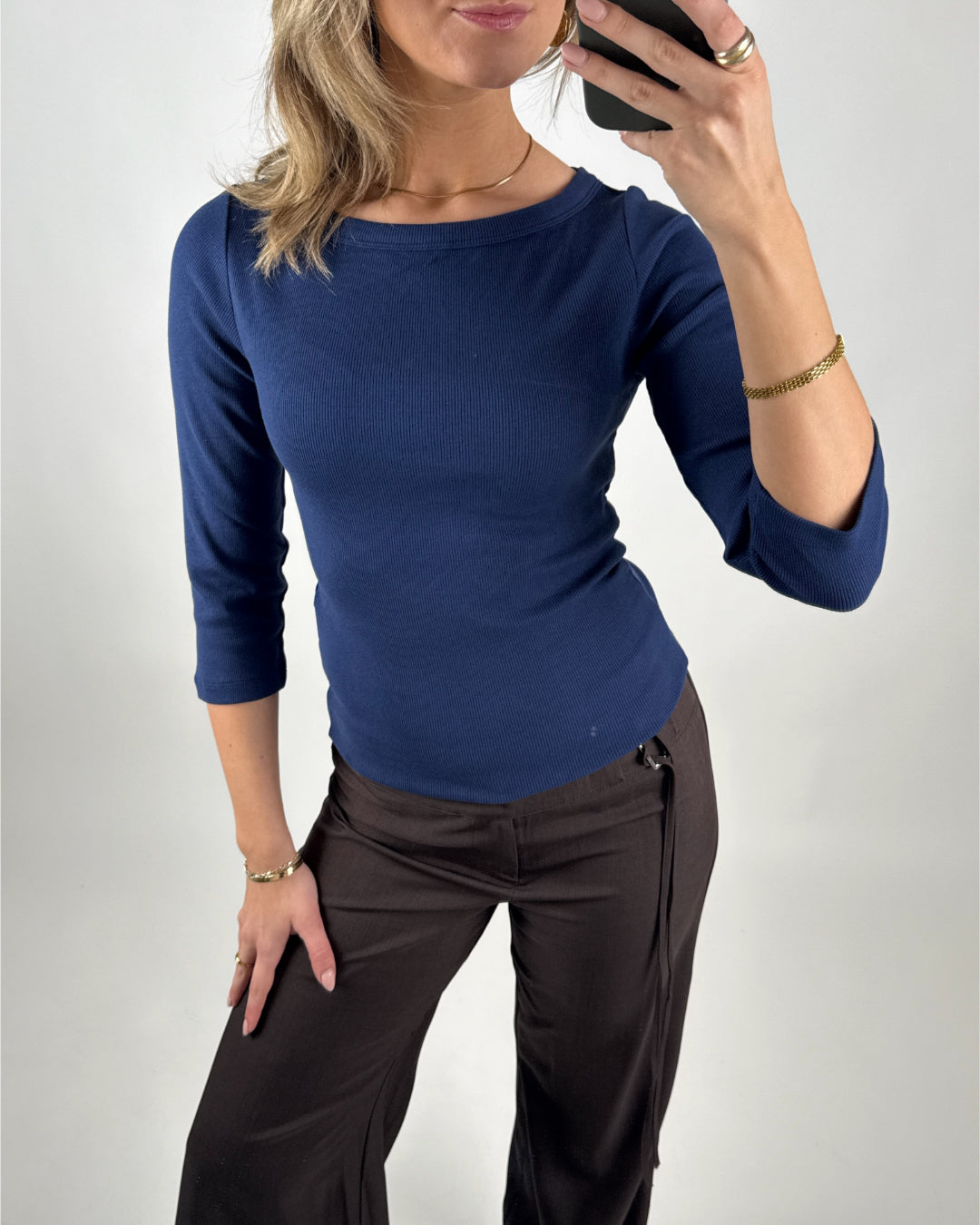 FIFI boatneck top, navy er i et blødt og ribbet materiale, hvilket gør at den fitter virkelig pænt! Den er blot en af vores mange smukke BLUSER som findes på hjemmesiden.