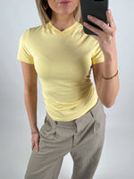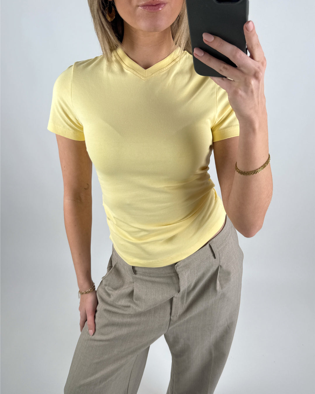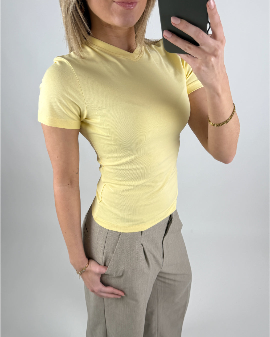 Vores GIGI V-hals t-shirt, gul er blot en af vores mange fine basic T-SHIRTS som findes på hjemmesiden.