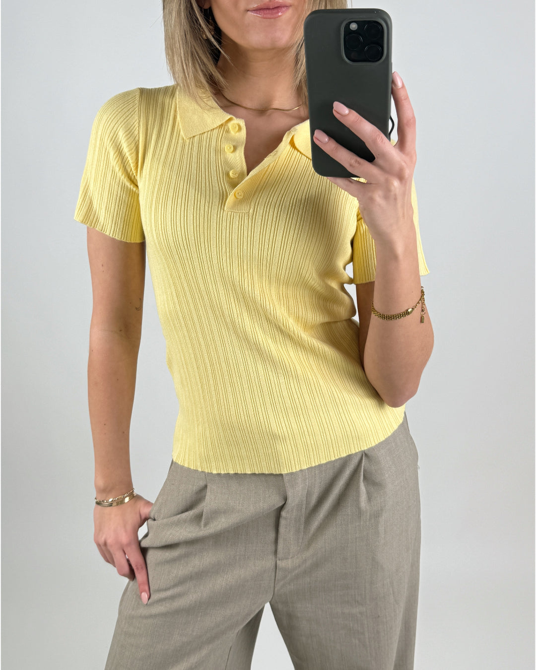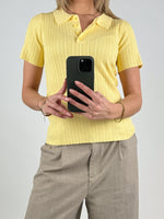 Opgrader din basisgarderobe med denne klassiske HADLEY polo strik, gul, som kombinerer komfort og stil. Strikken er lavet i et blødt og strækbart ribmateriale, der sikrer en perfekt, figursyet pasform og høj bevægelsesfrihed. Den har korte ærmer, polokrave og en fin knaplukning foran, som tilfører en sporty, men stadig elegant vibe – perfekt til både hverdagsbrug og lidt finere anledninger.