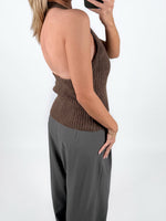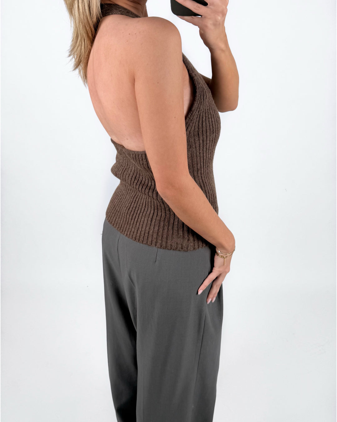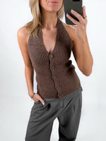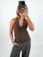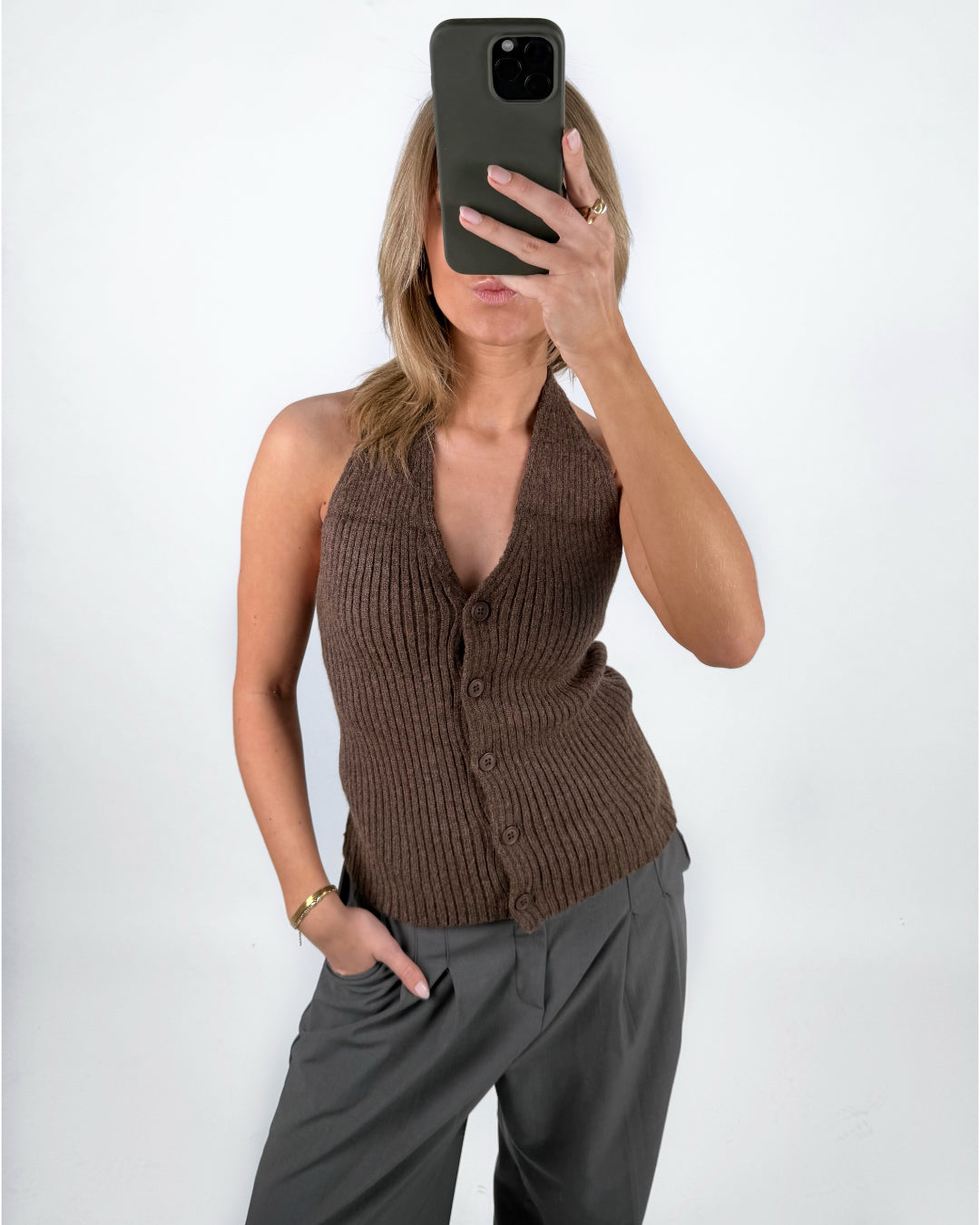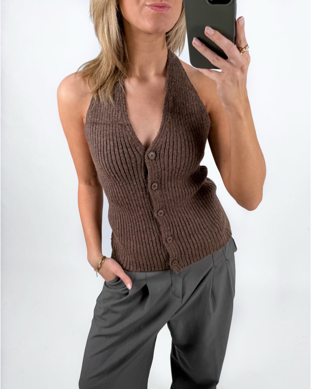Vores smukke CYNTHIA strikket top, brun er den fineste halterneck top i en varm brun farve. Toppen har åben ryg og knapper langs fronten.