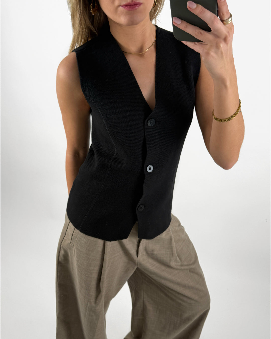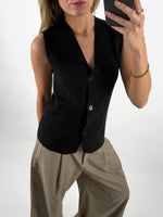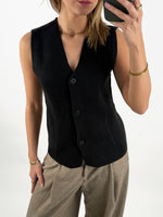 Tilføj et stilfuldt lag til dit outfit med denne HAVEN top, sort med knapper. Toppen har et enkelt og moderne design med V-udskæring og diskrete knapper foran, der fuldender det elegante udtryk.