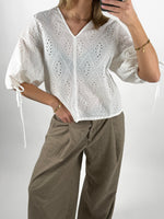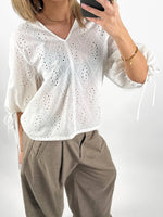 Den feminine kortærmede JOELLA bluse, hvid, har et væld af smukke detaljer. Det fine broderi i stoffet giver et elegant og unikt udtryk, mens bindebåndene ved de korte ærmer tilfører en ekstra fin detalje.