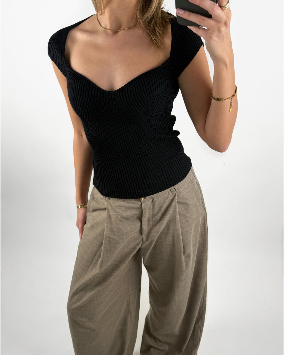 Det let ribbede materiale smyger sig elegant til kroppen og fremhæver figuren på fineste vis. Perfekt både til hverdag og mere afslappede anledninger – style den med jeans, nederdel eller som her med finere bukser for et friskt og tidløst look. En alsidig favorit, du vil vende tilbage til igen og igen.