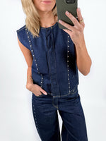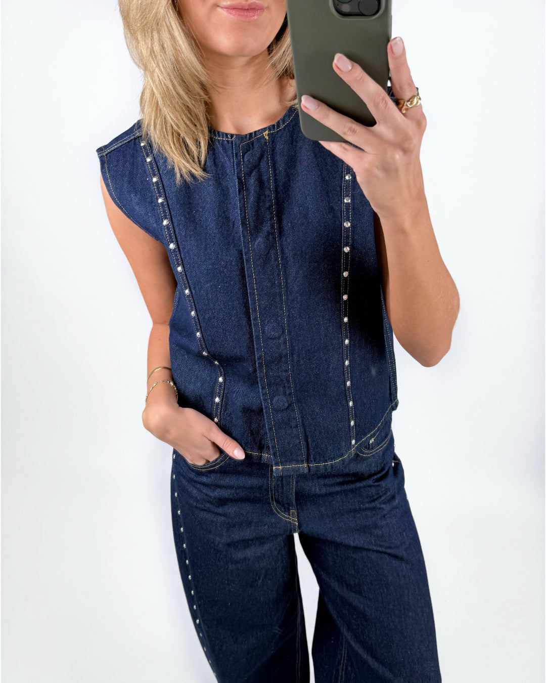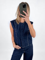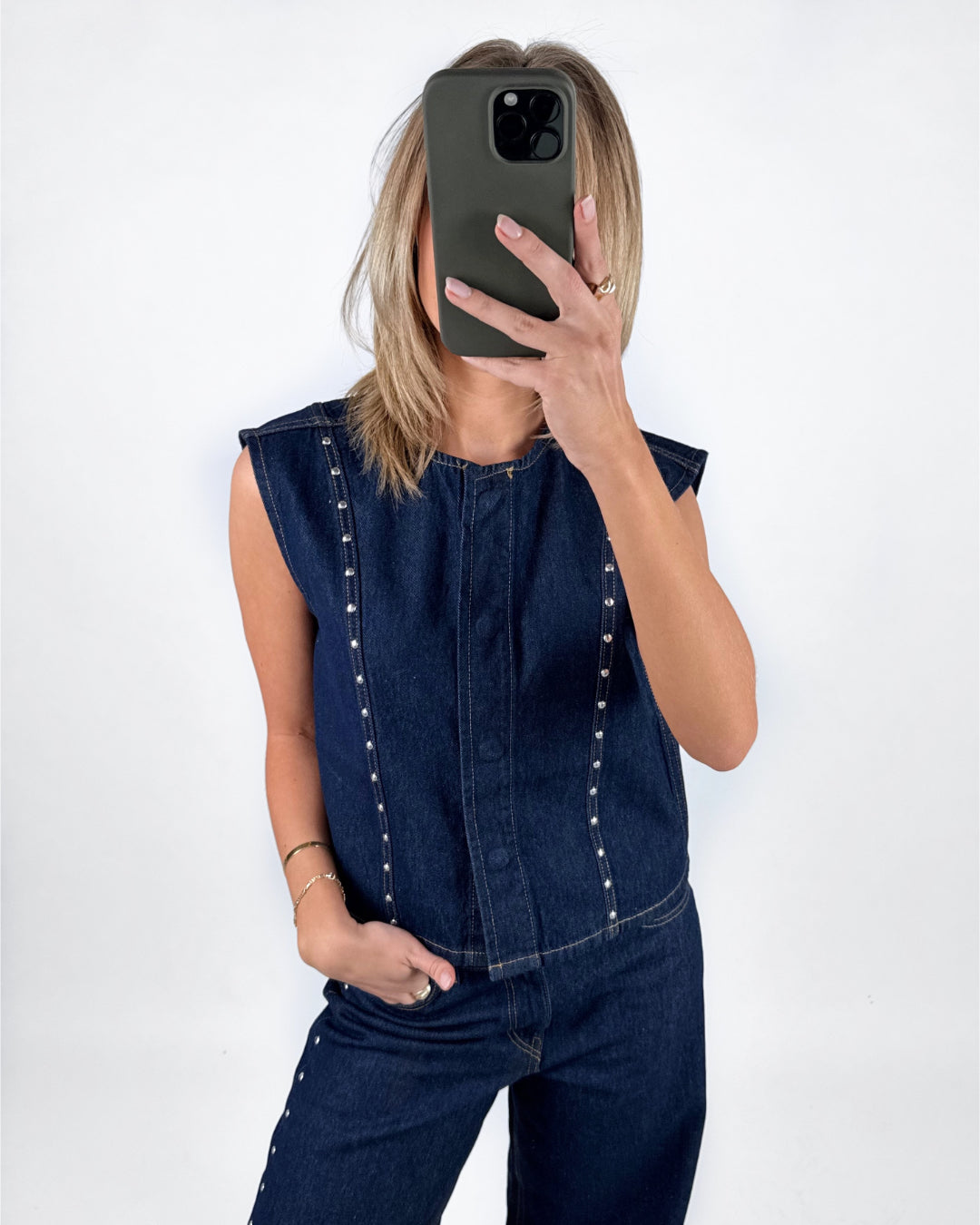 Den smukke MAE denim top, mørkeblå er den perfekte denim top med et twist. Toppen har snit som en denim vest, og har smukke stud detaljer. Toppen har en matchende underdel, så det sammen udgør et cool denim sæt.
