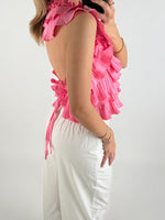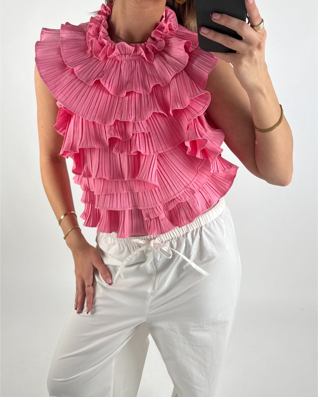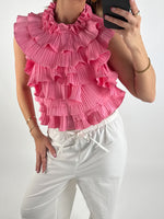 Denne iøjnefaldende RHINA flæse top, lyserød er et perfekt valg til dig, der ønsker at tilføje et feminint og eksklusivt touch til garderoben. Toppen er designet med adskillige lag fine, plisserede flæser, som skaber et voluminøst og festligt udtryk. Den har en smuk høj hals, der lukkes med en lille knap i nakken for et elegant og raffineret finish. Ryggen er åben og lukkes med fine snører over lænden, hvilket både sikrer en flot pasform og tilføjer et sensuelt og moderne look.