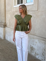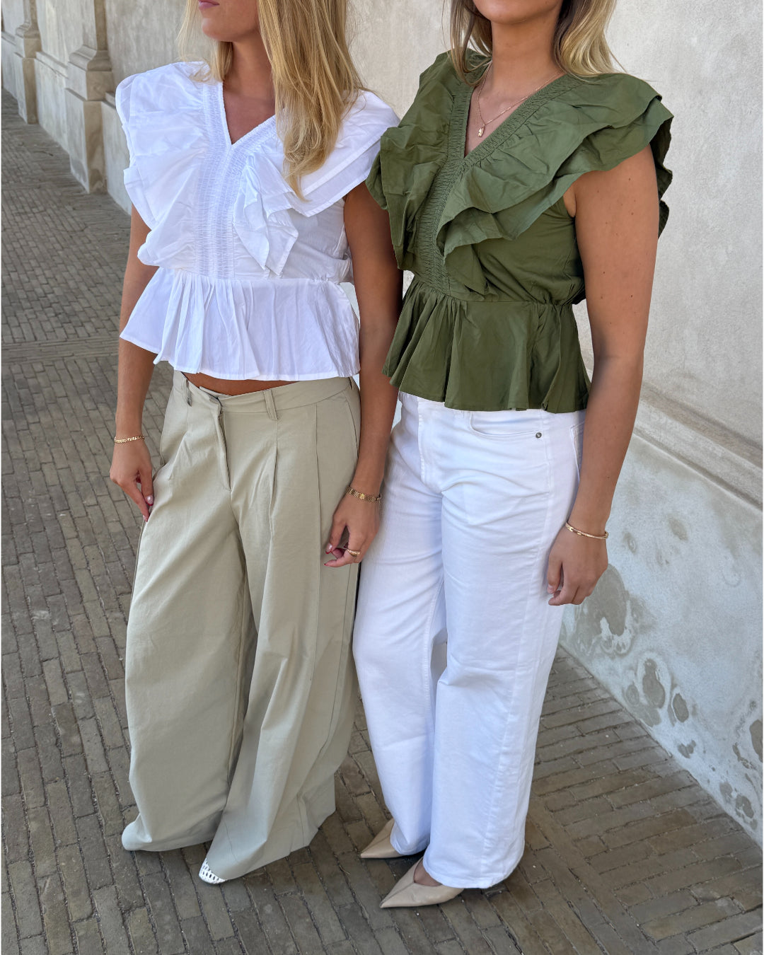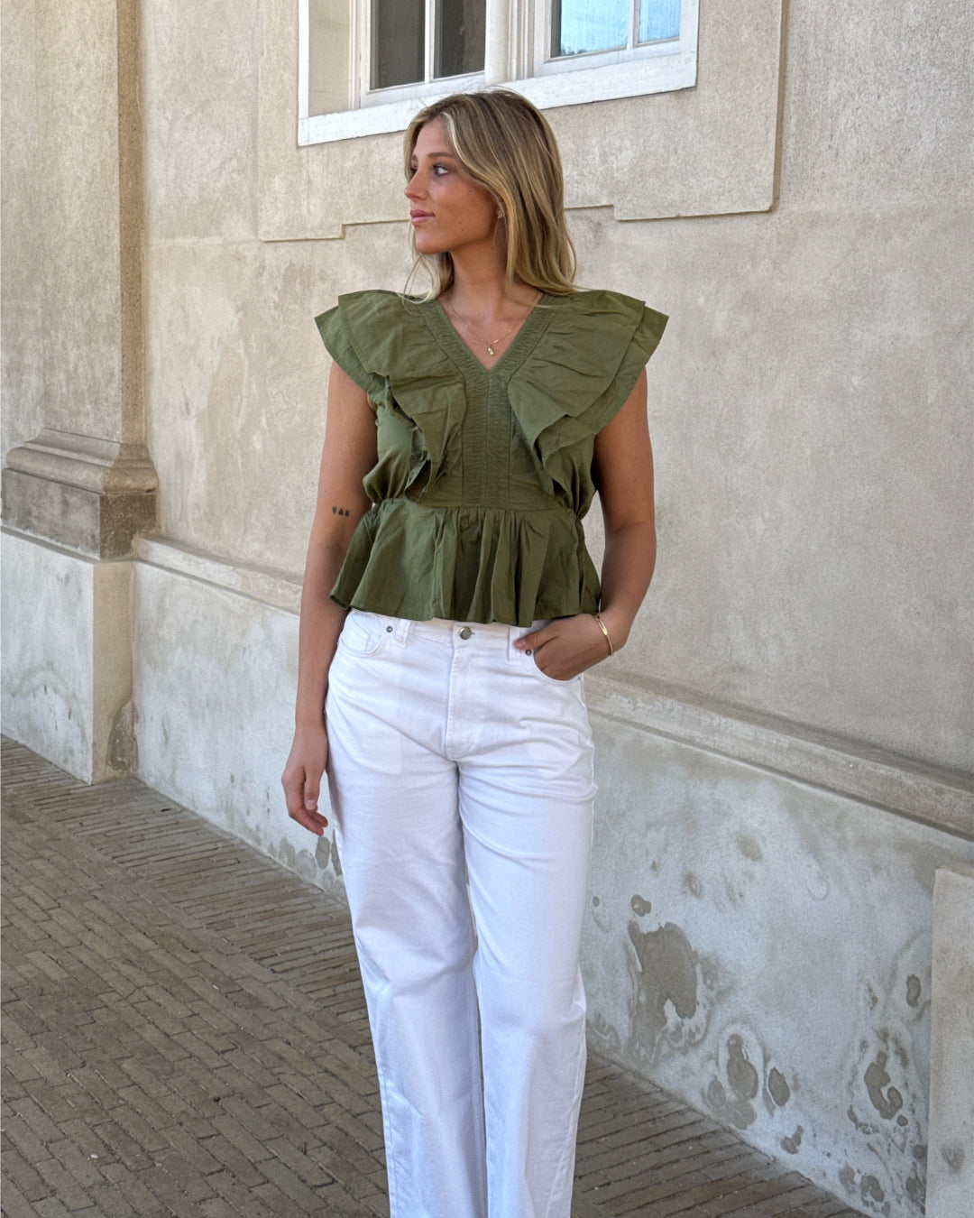 Vores elegante RIKKE flæsetop, army er den smukkeste top med de fineste flæse detaljer.