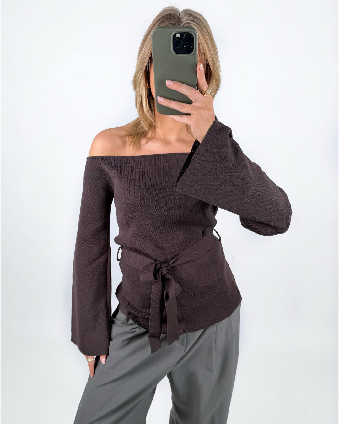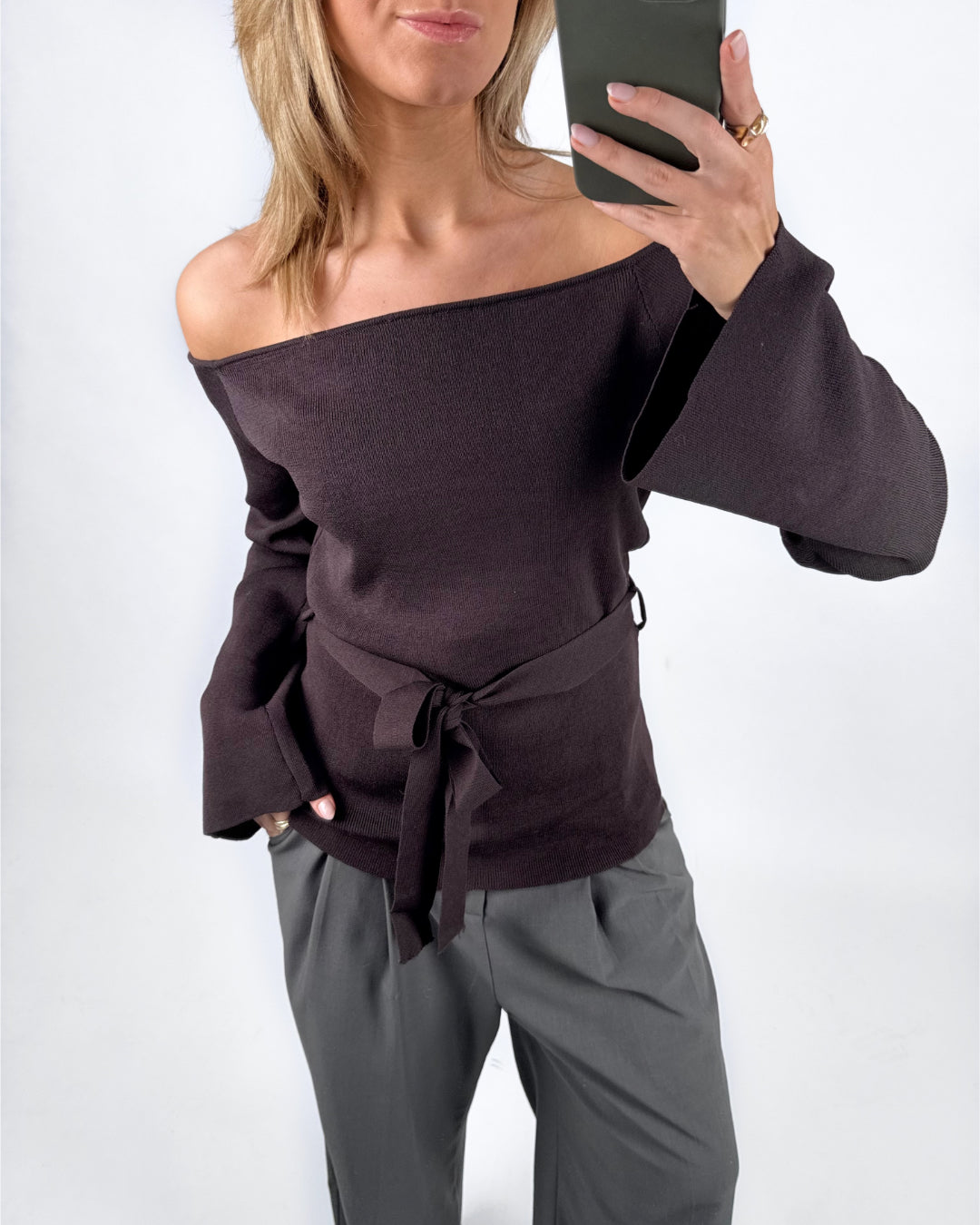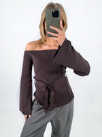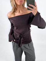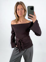 Den smukke SAVANNA off shoulder strik, brun er en smuk strikket bluse med off shoulder look og bindebånd i taljen.