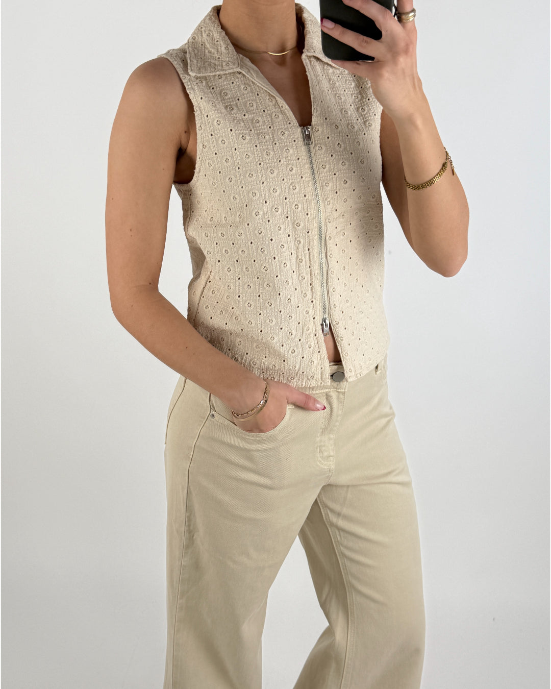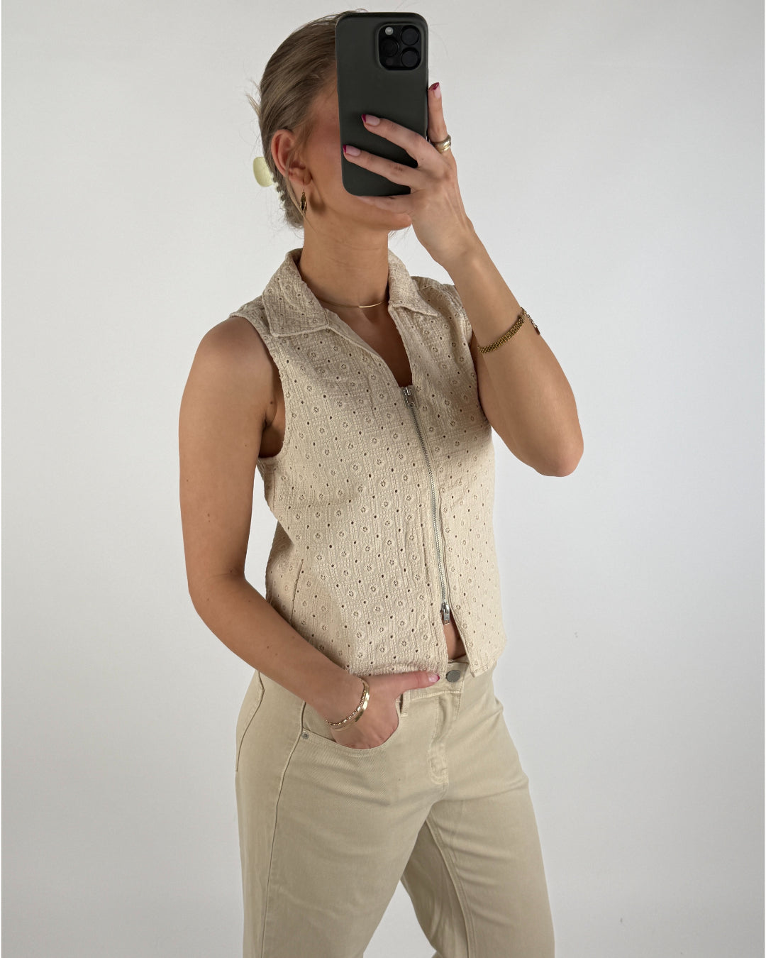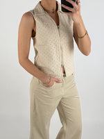 Lækker og feminin ærmeløs top i en blød, cremefarvet nuance. Toppen er designet med et elegant, broderet hulmønster, som giver et let og sommerligt udtryk. Den har klassisk krave og lynlås foran, der gør den både moderne og stilfuld.