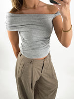 VIVIENNE off shoulder top, grå oser af elegance og selvsikkerhed. Den unikke, snoede detalje ved den ene skulder tilføjer et spændende twist og gør toppen ekstra iøjnefaldende.