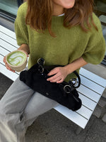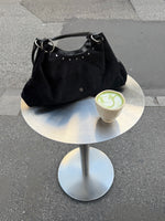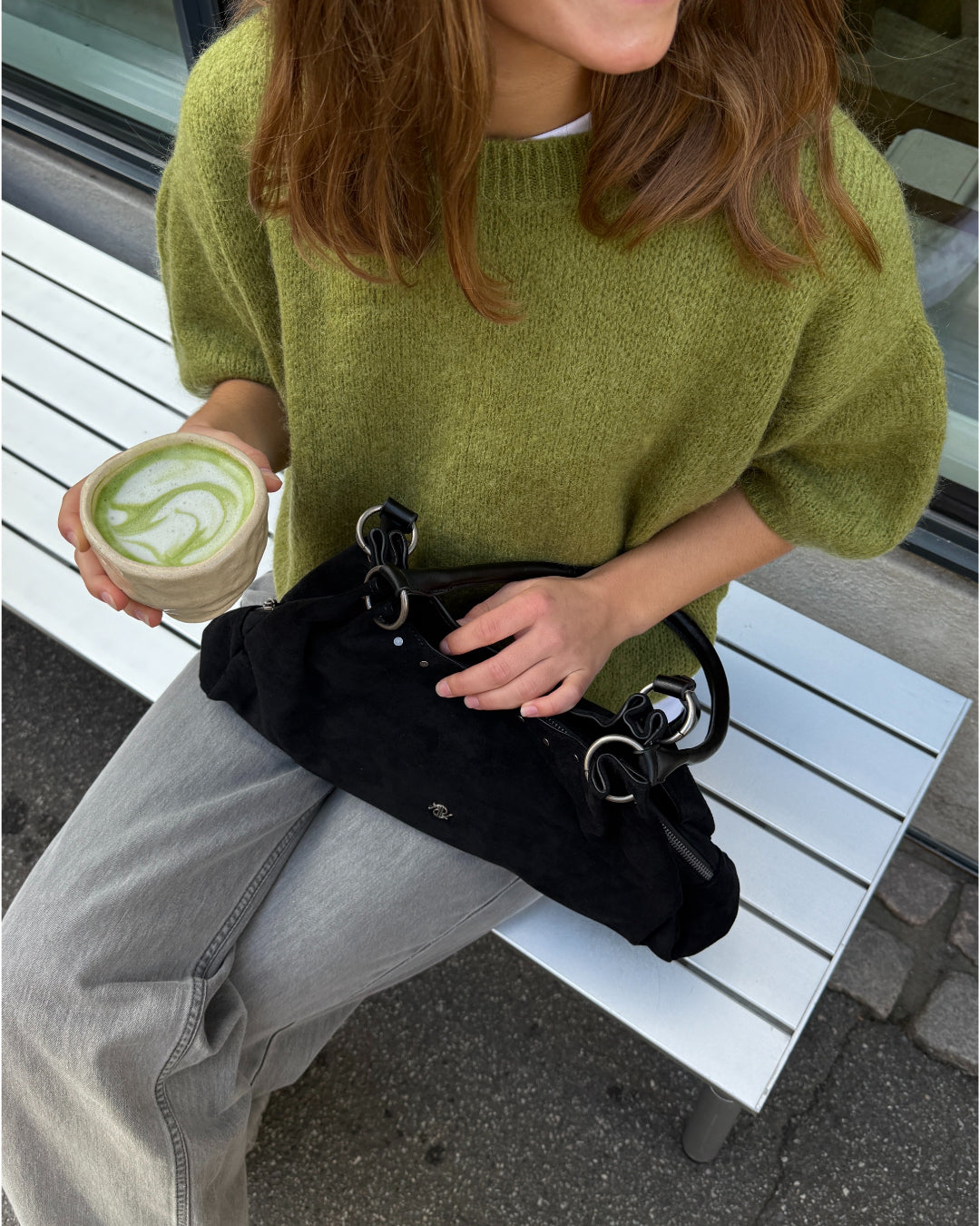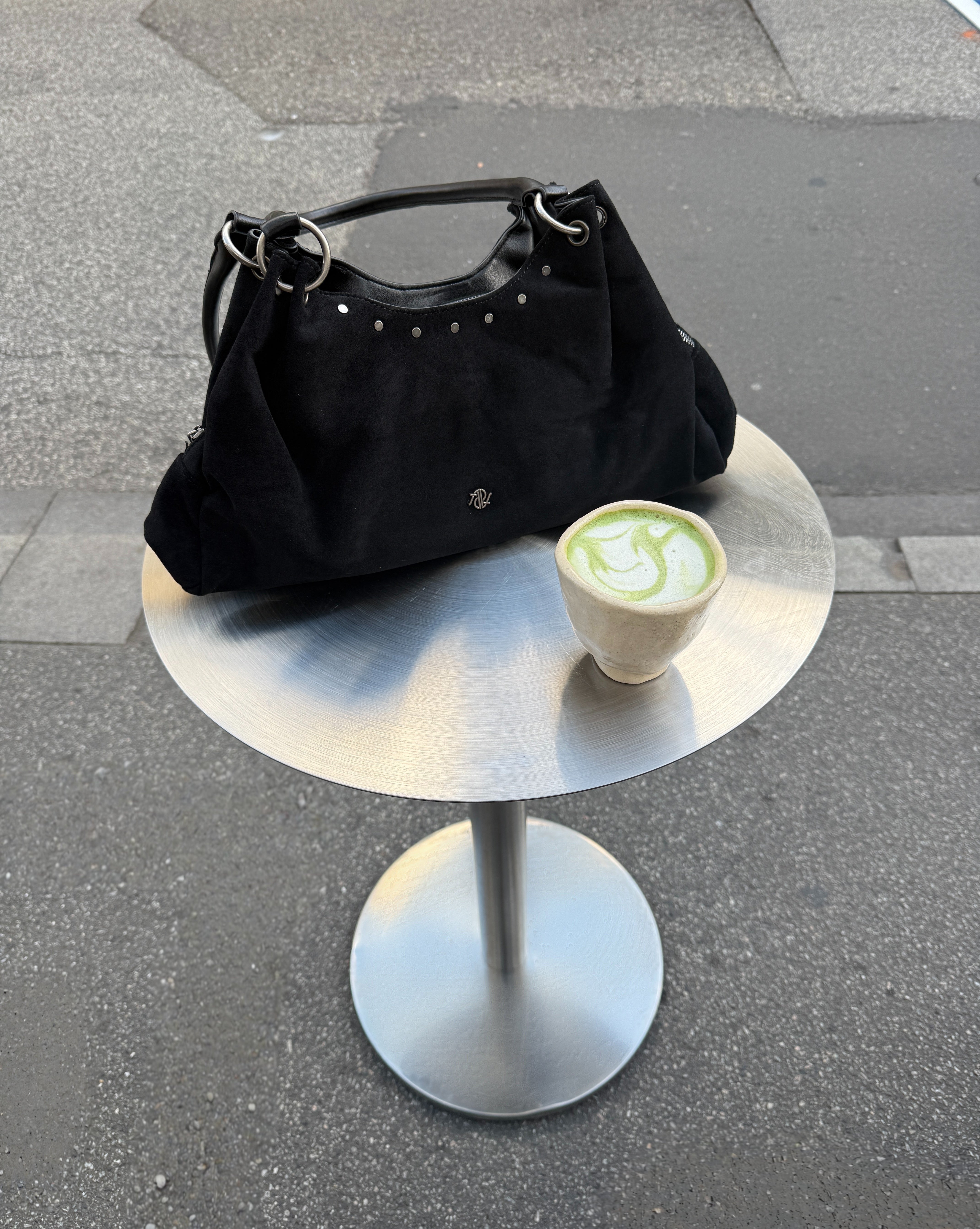 Den smukke AYLANI taske, sort er lavet i et ruskindslignede stof, er pyntet med nitter. Tasken består af flere rum og har to mindre lynlåslommer.