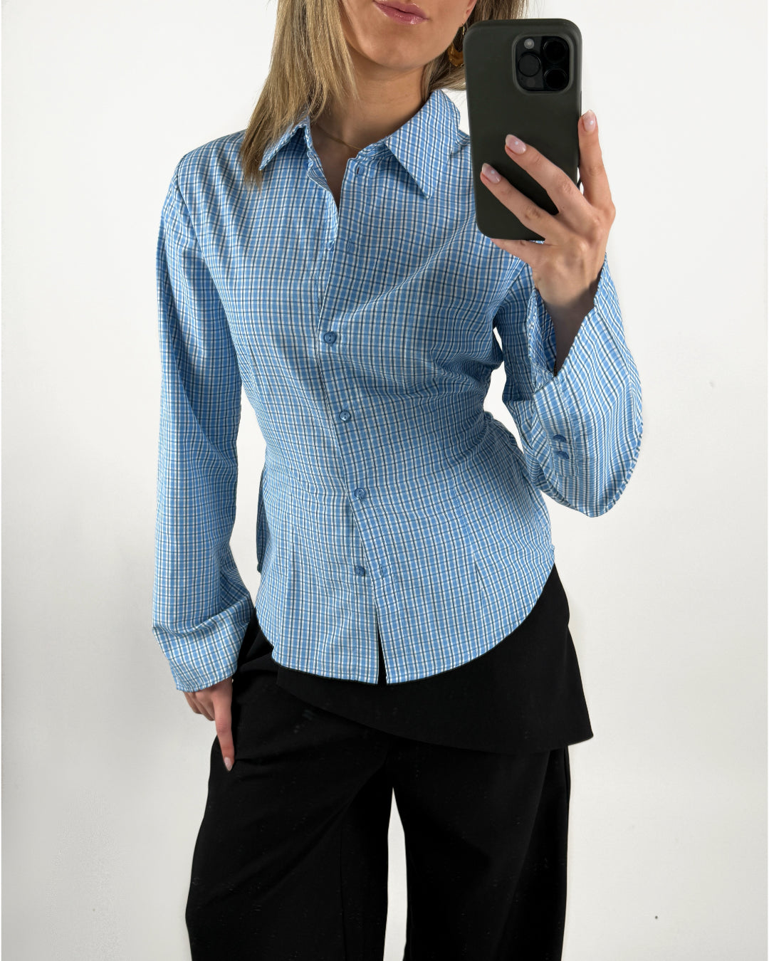 CARO waisted skjorte, ternet blå er den perfekte basis skjorte, med et lille twist til garderoben. Du kan se alle vores skjorter HER.