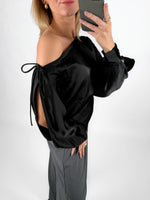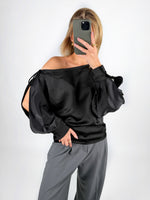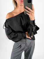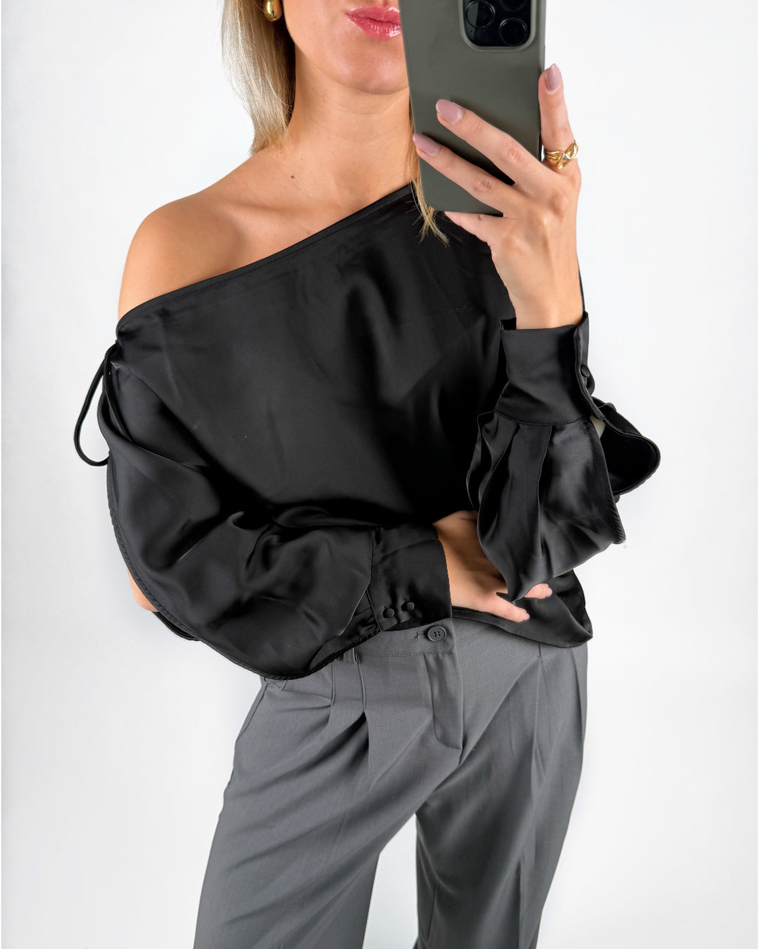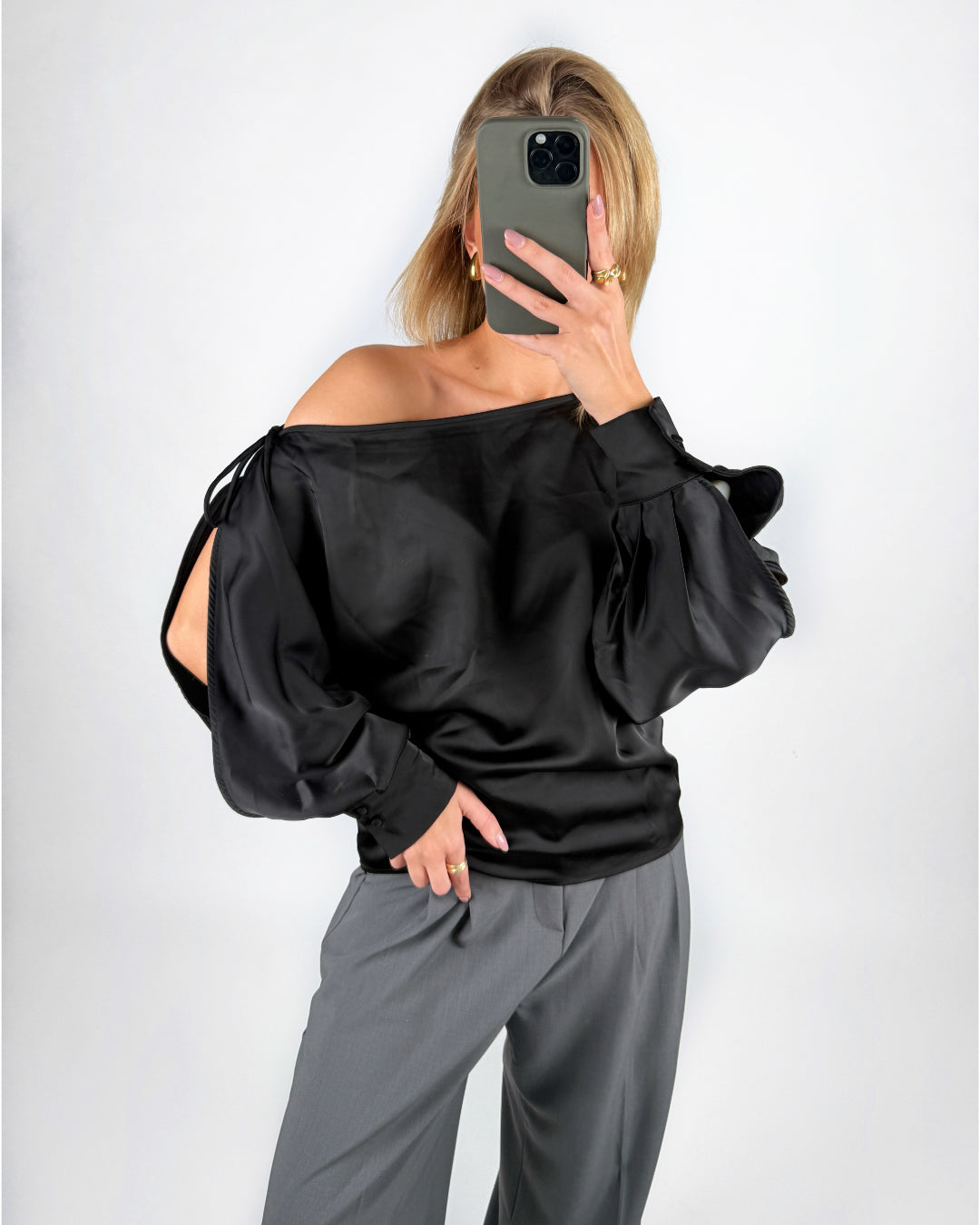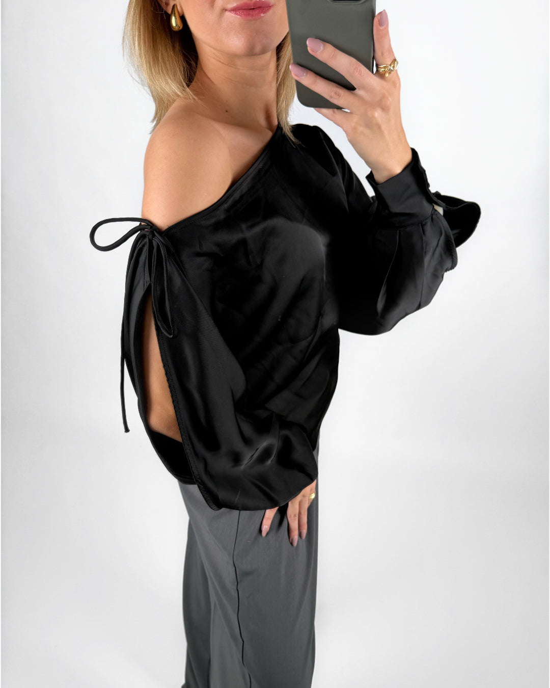 Vores fine DAVINA one shoulder bluse, sort er den smukkeste bluse med et asymmetrisk snit og detaljen med de "åbne" sider i ærmerne.