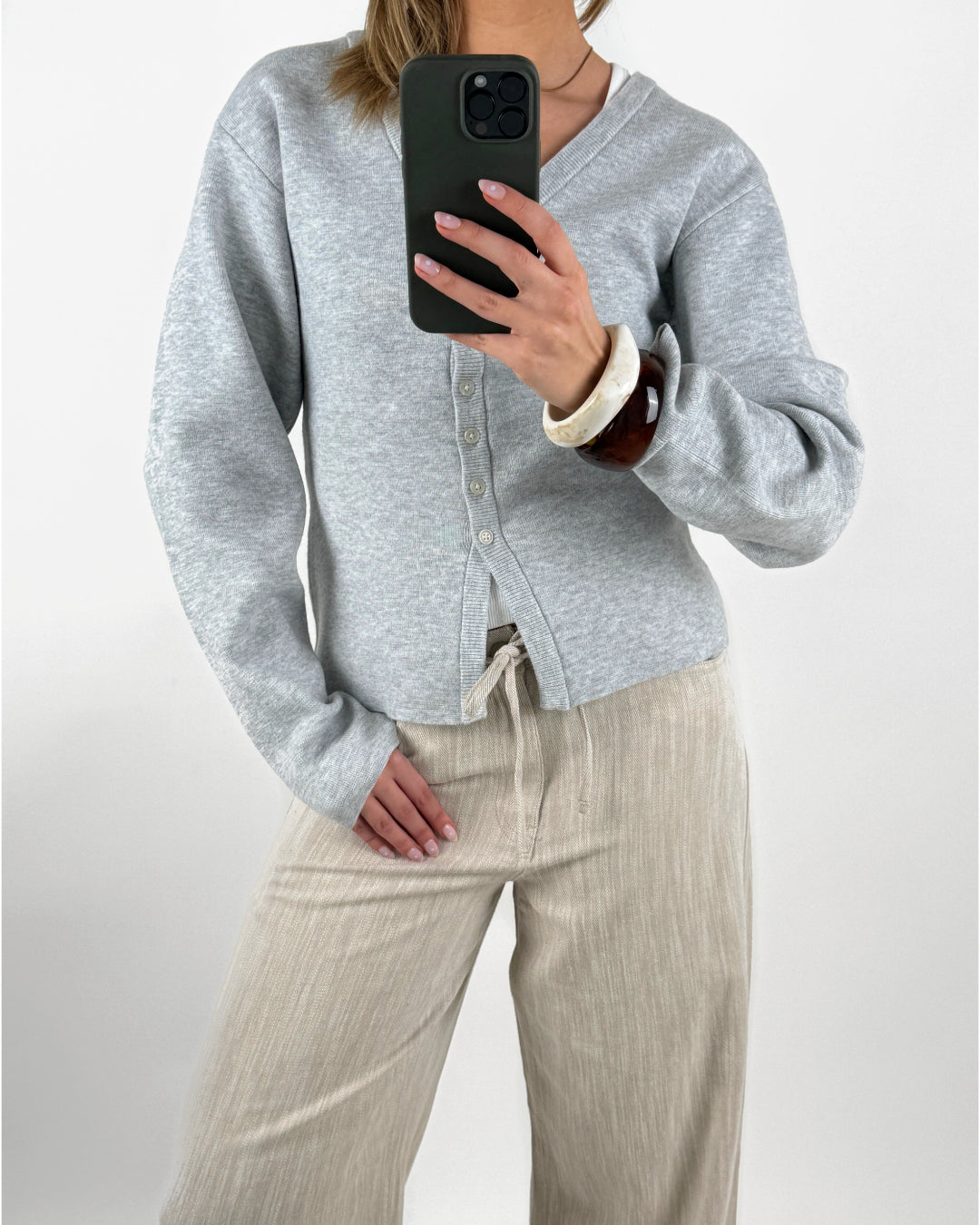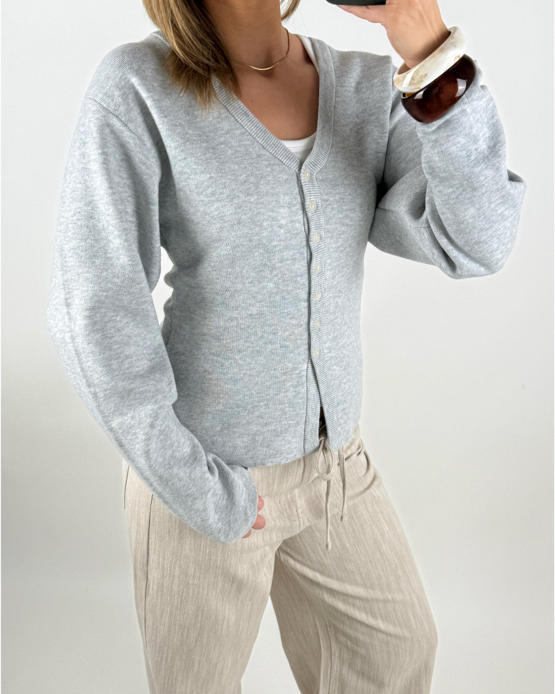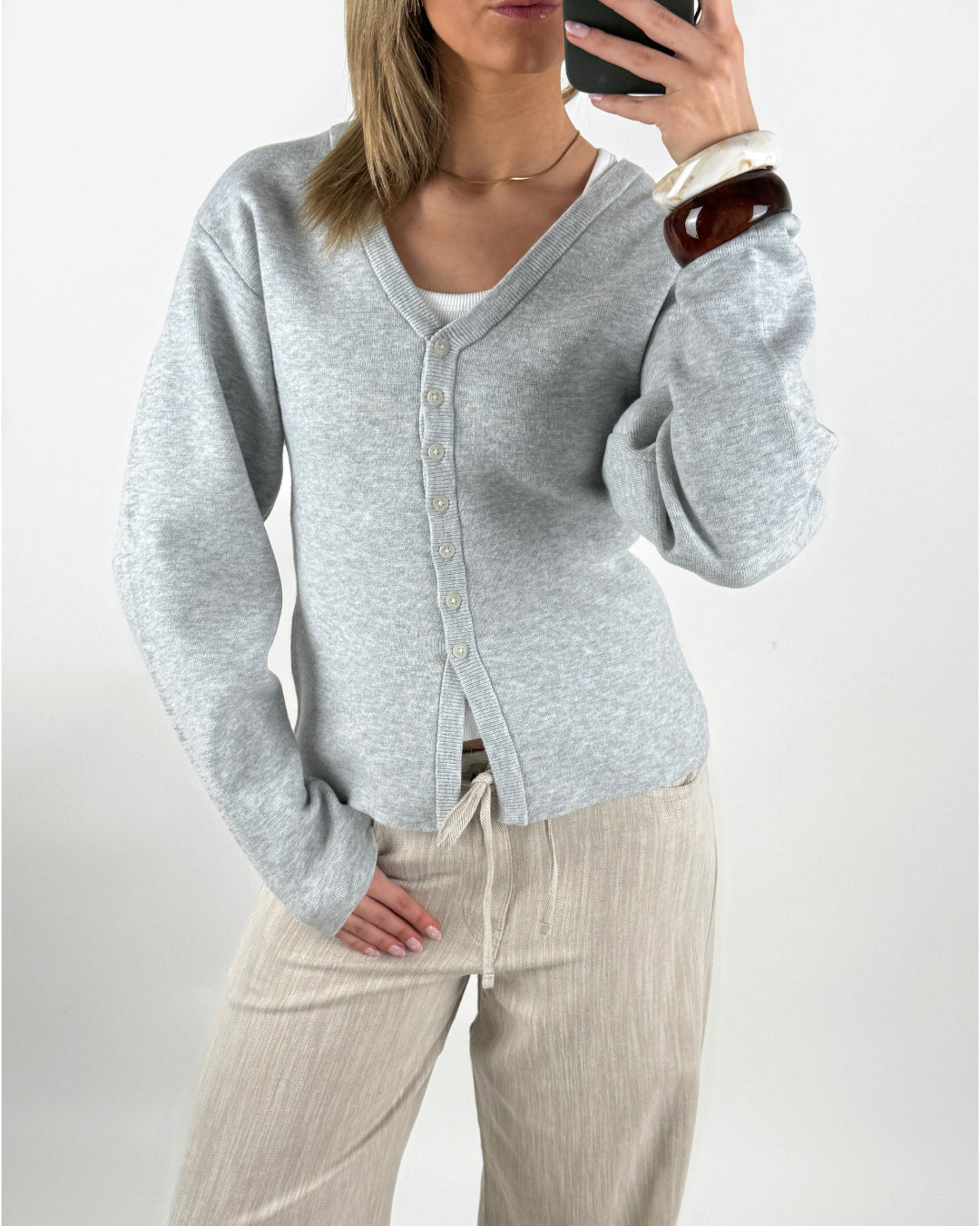 Denne klassiske DIANA cardigan, grå er designet med en elegant V-udskæring og lukkes med fine knapper foran. Cardiganen er udført i en blød, lysegrå kvalitet, som gør den både komfortabel og stilfuld.