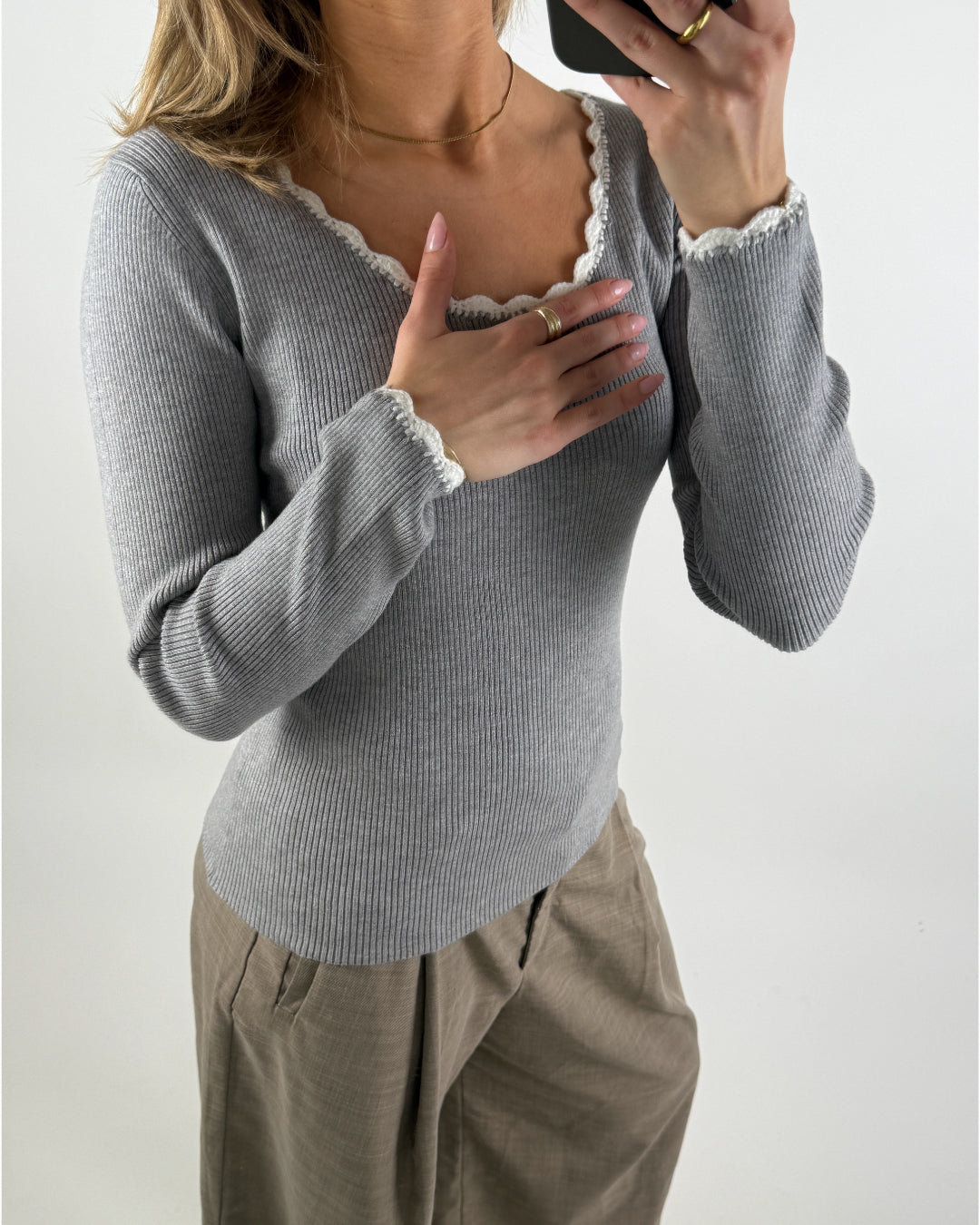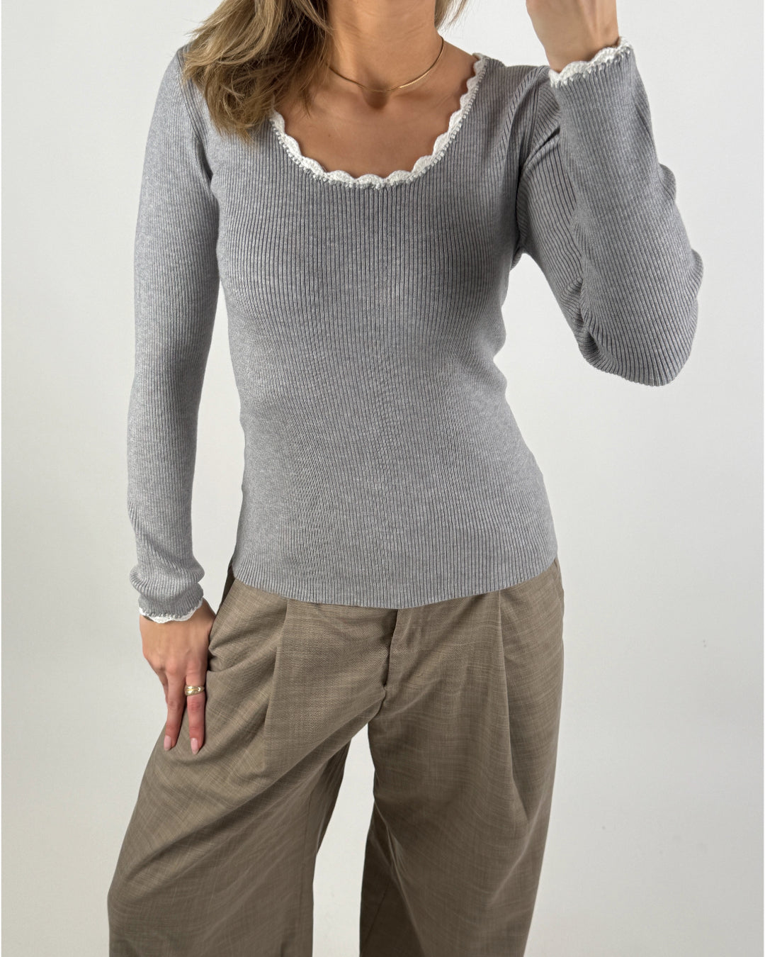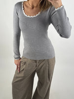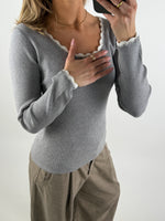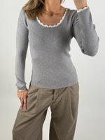 Smuk, feminin ELLA bluse, grå/hvid i blød ribstrik – perfekt som basis i garderoben hele året rundt. Blusen fås i tre klassiske farvevarianter: lysegrå med hvid kant, sort med hvid kant, samt hvid med sort kant.