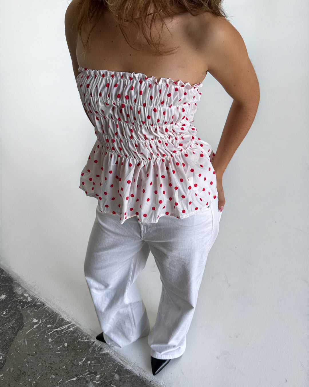 EMERIE top, hvid er en sød stropløs top med smock effekt. Den kan bruges til et par simple jeans, men kan også dresses op til mere festlige lejligheder. Den er i hvidt stof med røde prikker.