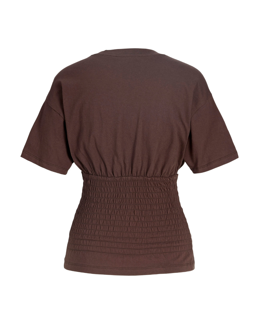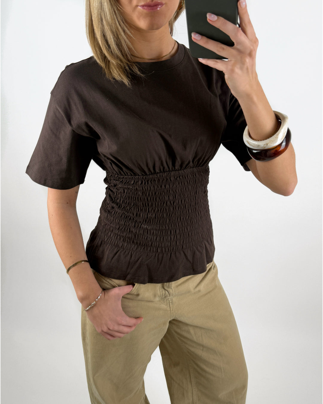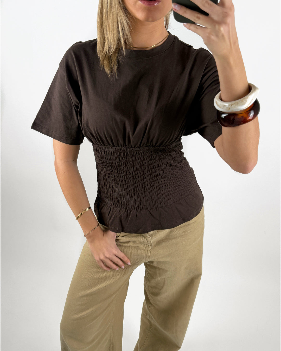 Opgrader din basisgarderobe med denne stilfulde EVELYN smock t-shirt, brun, der skiller sig ud med sin flotte smock-effekt i taljen.
