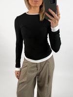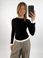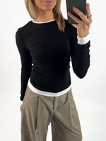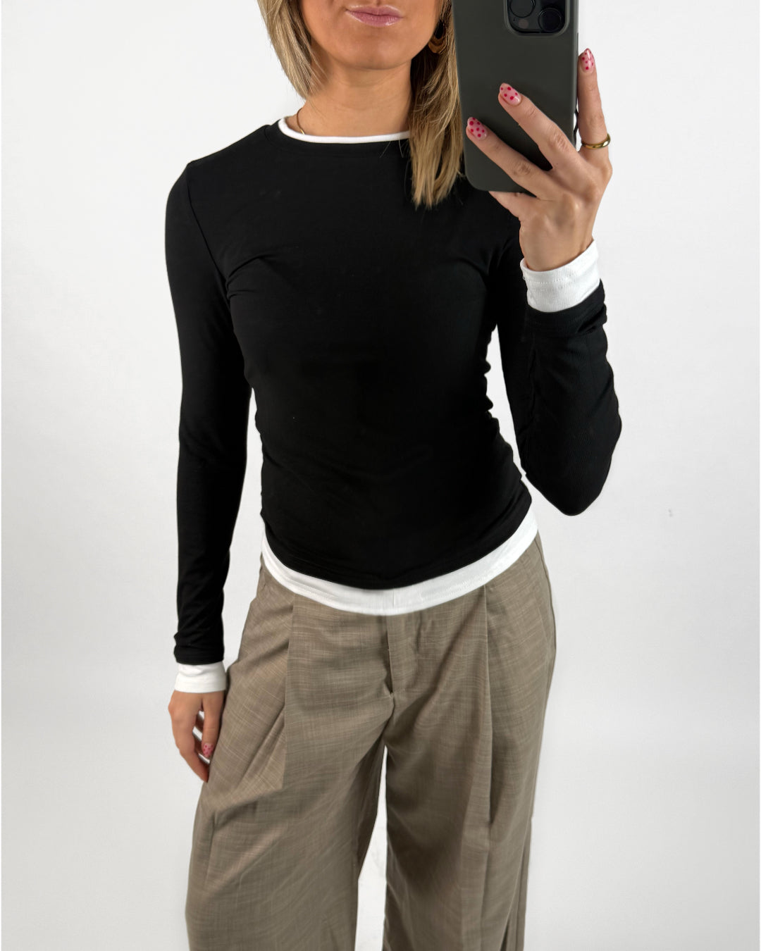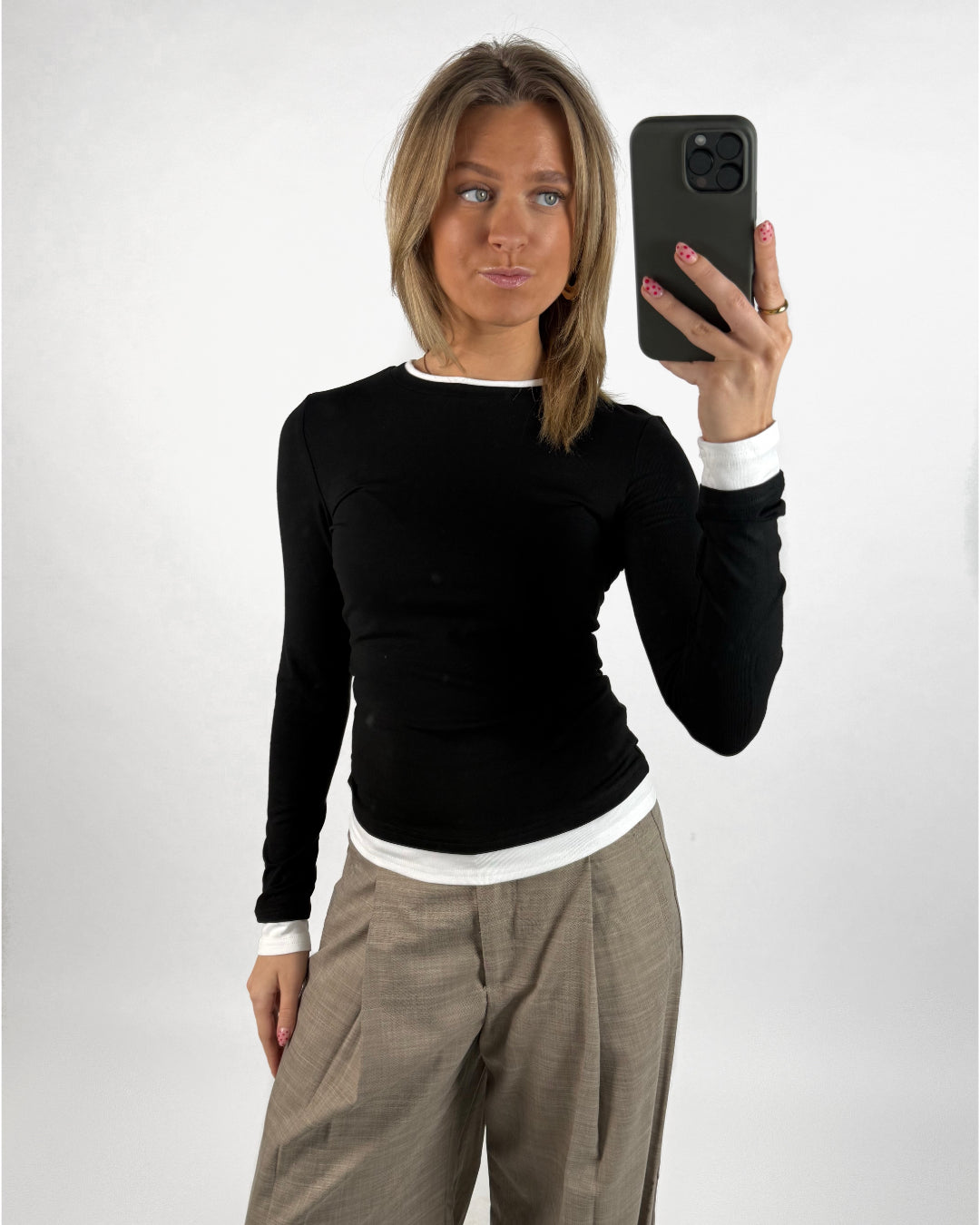 Den smukke EVIE langærmet, sort er den perfekte tætsiddende langærmede t-shirt. T-shirten har det cool dobbelt t-shirt look, da det ligner der er en trøje inde under.